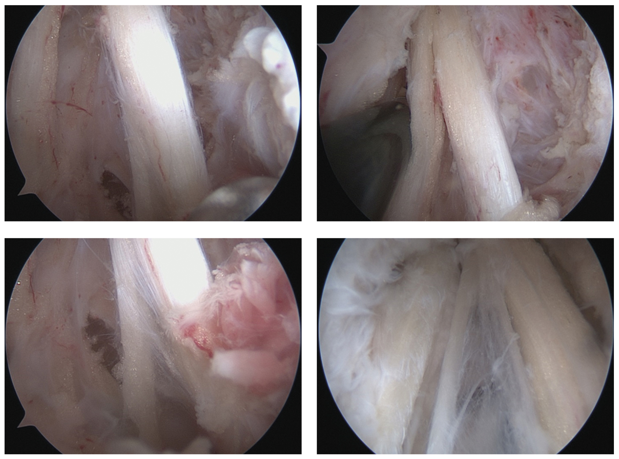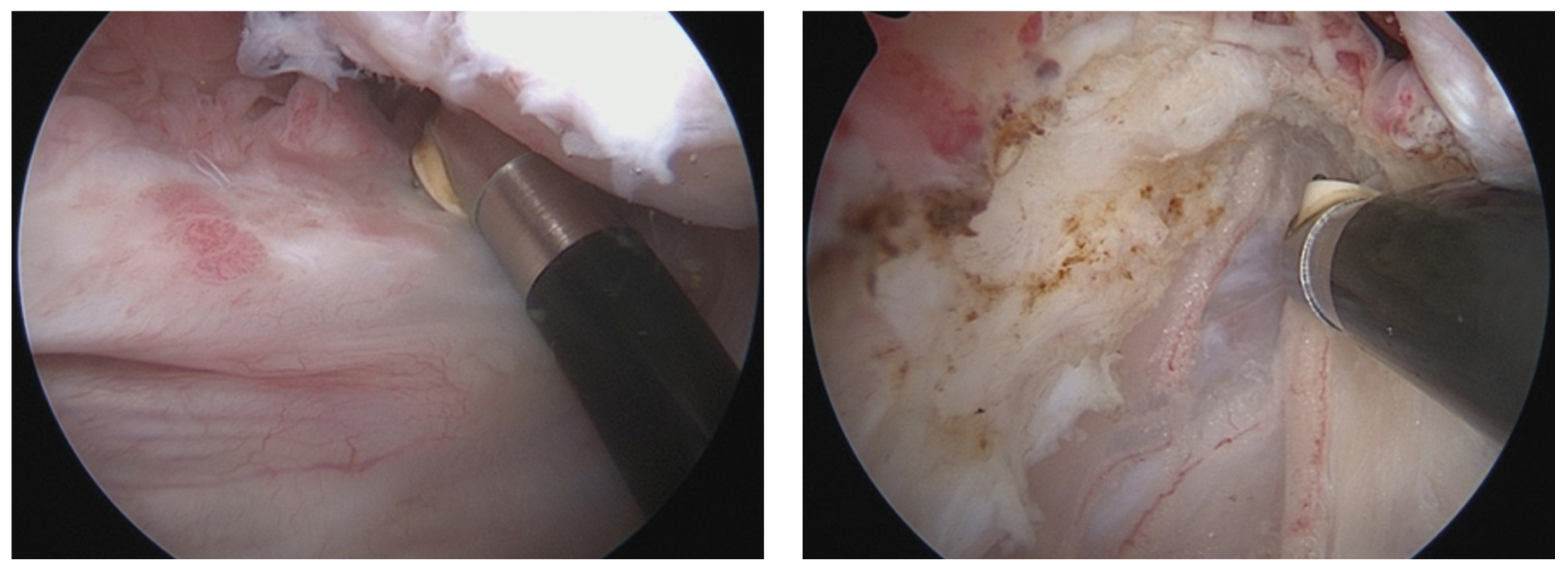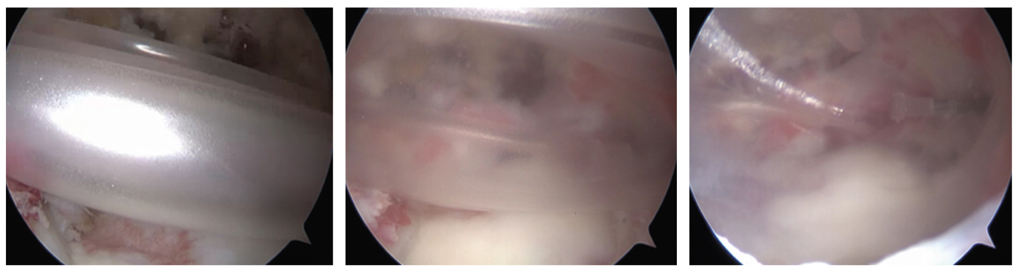 После диагностического этапа артроскопии осуществляли лечебный этап по поводу внутрисуставной патологии, который включал тенотомию при явлениях теносиновита и повреждениях сухожилия длинной головки двуглавой мышцы плеча (рис. 2), восстановление вращательной манжеты плеча при ее повреждении, дебридмент при дегенеративных изменениях фиброзно-хрящевой губы, дебридмент и абразивную хондропластику шейвером и аблятором при наличии хондромаляции головки плечевой кости и/или суставного отростка лопатки.