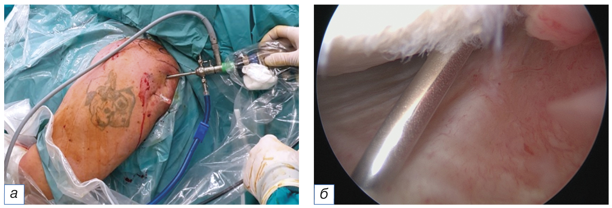 Рис. 4. Задненаружный доступ к плечевому суставу: a — введение спинальной иглы в проекции задненаружного доступа; б — визуализация кончика иглы в суставе на мониторе. / Fig. 4. Posterior access to the shoulder joint: a — introduction of a spinal needle in projection of postero-lateral portal; б — viewing on monitor of a needle tip in a joint.