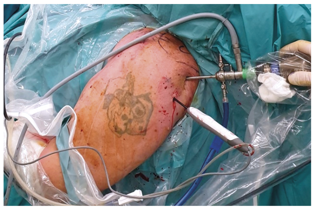 Стандартным вмешательством при посттравматической нейропатии подмышечного нерва является невролиз из протяженного кожного разреза (10–15 см) с тракцией крупных мышечных групп. С развитием эндоскопической техники встал вопрос о возможности выполнения эндоскопического невролиза, его преимуществах перед открытой хирургией, уточнении показаний и сравнении результатов лечения. Так, согласно проведенным метаанализам, эндоскопическая техника по эффективности не уступает открытому невролизу, вместе с тем позволяет снизить длительность нетрудоспособности, улучшить косметические результаты, уменьшить количество анальгетиков в послеоперационном периоде, осмотреть нервный ствол на более протяженном участке [9]. Малоинвазивный эндоскопический доступ имеет ряд преимуществ по сравнению с открытой хирургией: меньшая травматизация тканей, лучший косметический эффект, малый риск рецидивов, возможность одномоментной коррекции внутрисуставной патологии.