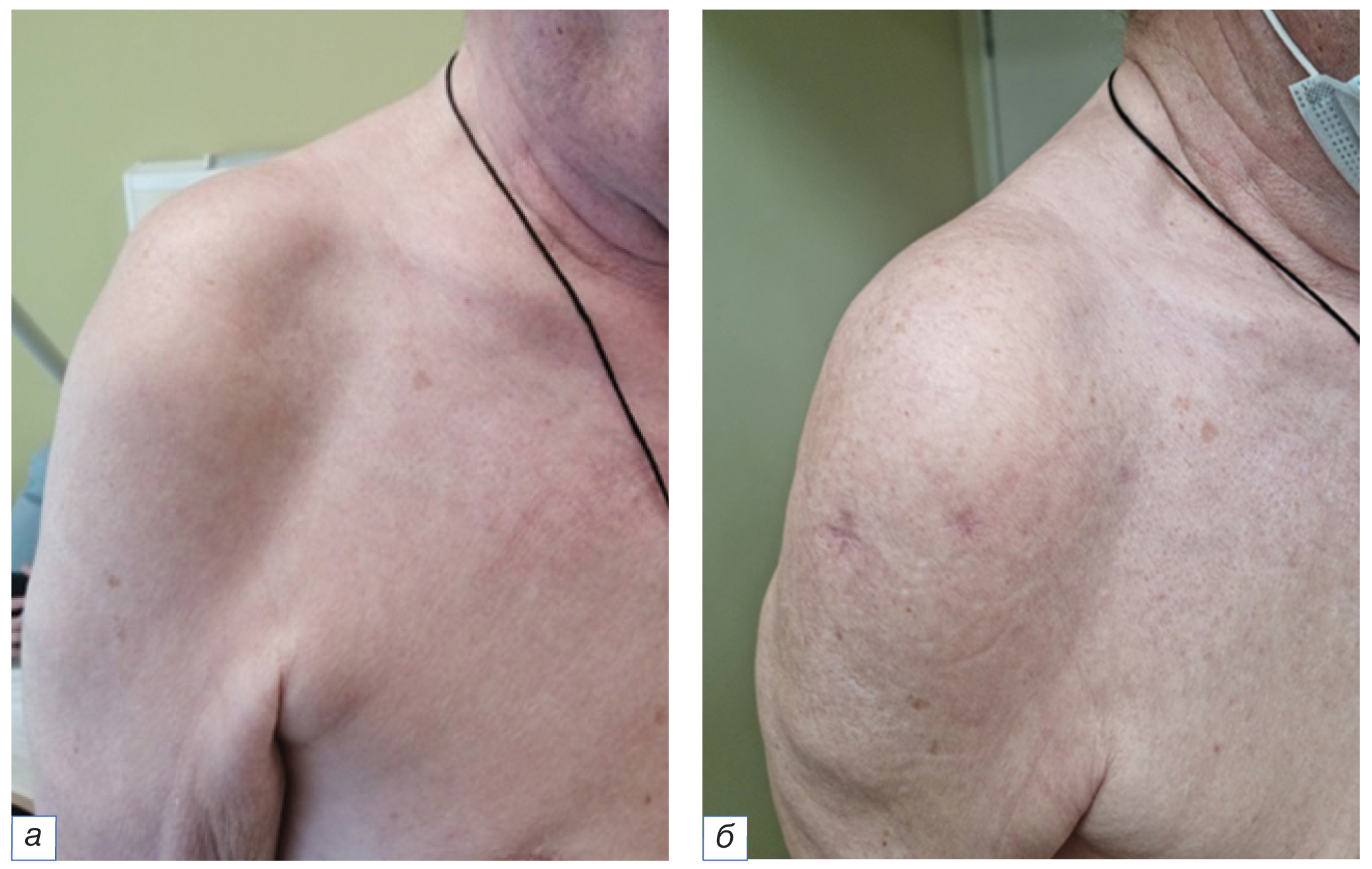 Рис. 8. Восстановление объема и контура дельтовидной мышцы после операции: a — вид до операции; б — через 6 мес после операции. / Fig. 8. Restoration of volume and contour of a deltoid muscle after the surgery: a — before the surgery; б — 6 months after the surgery.