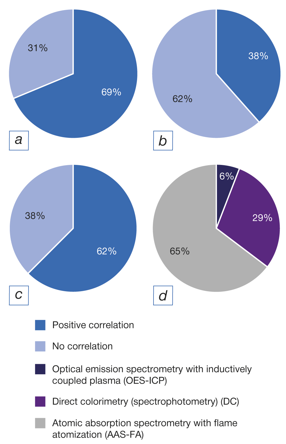 Fig. 1. Correlation of zinc levels with sperm parameters according to the literature. Frequency of zinc relationship with the amount (a); morphology (b) and motility (c) of spermatozoa; (d) — methods for determining zinc in spermoplasm.