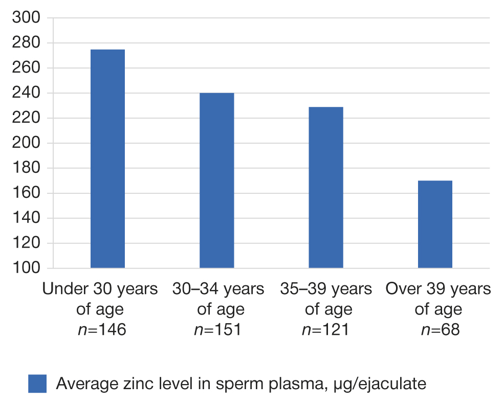 Results: A significant negative correlation of the zinc level in the spermoplasm with the age of men was revealed (r=-0.16; p <0.001). The level of zinc in the spermoplasm weakly negatively correlated with the dilution time and with the viscosity of the sperm. The positive correlation was found with the number of spermatozoa (r=0.13; p <0.01) and their mobility (r=0.38; p <0.00001). The level of zinc in the spermoplasm negatively correlated with the degree of the sperm DNA fragmentation and with the amount of reactive oxygen species, and positively correlated with the results of the test for binding to hyaluronic acid.