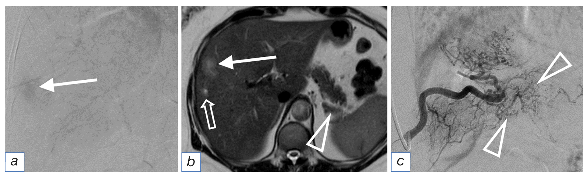 Fig. 2. Angiography (а): intense contrast of a metastasis with a diameter of 3 cm (white arrow); magnetic resonance imaging (b): the same metastasis with a diameter of 3 cm with slit necrosis in the structure (long arrow), an infiltrative metastasis with a diameter of 0.5 cm with a locally expanded bile duct in the center (3D arrow), the pancreatic tail tumor (triangular arrow); angiography of the pancreatic tumor (c): branched network of afferents (triangular arrows).