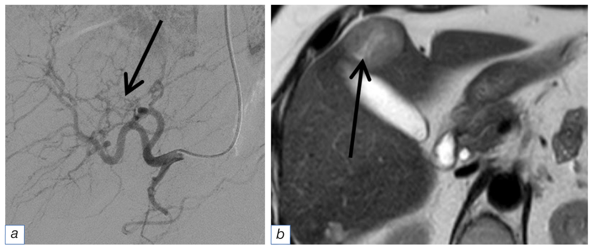 Fig. 3. The same patient. Angiographic picture of another metastasis with a diameter of 3 cm (а): several thin recalibrated vessels (arrow) exiting in an atypical place; magnetic resonance imaging of the same metastasis (b): slit necrosis in the structure (arrow).