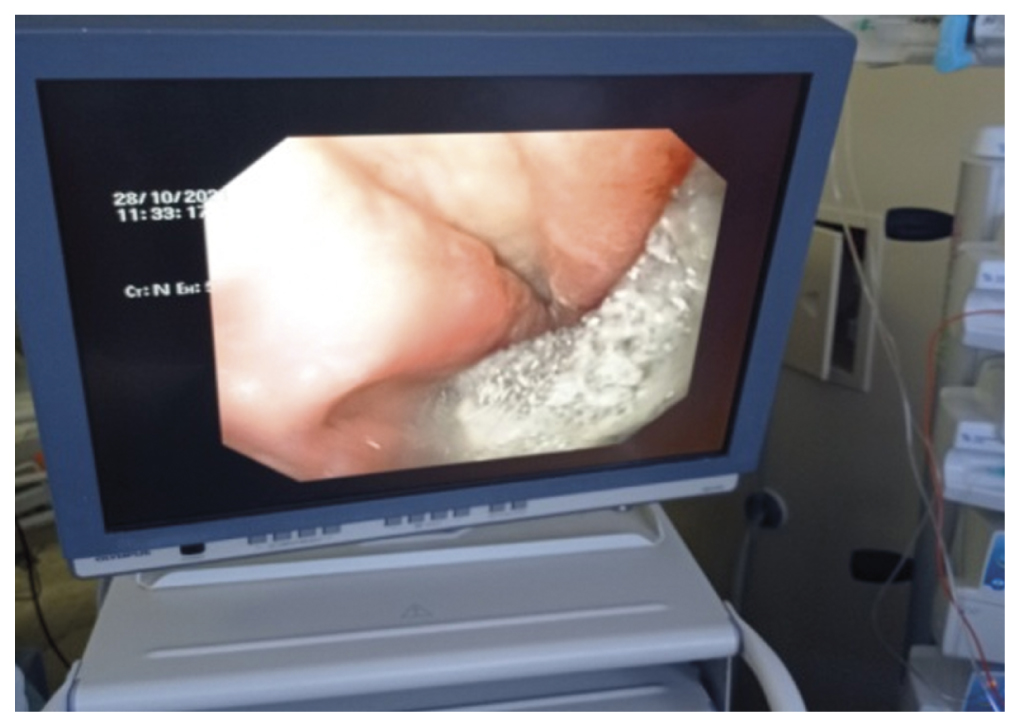 Ревизионная операция заканчивается эндоскопическим этапом — внутрипросветной установкой губки вакуумной аспирационной системы. Площадь смоделированной губки должна быть чуть больше размера дефекта ГЭА. Губка фиксируется вокруг тонкого назогастрального зонда несколькими капроновыми нитями. С помощью гастроскопа к зоне ушитой несостоятельности ГЭА под визуальным контролем подводится зонд с губкой (рис. 2, 3). После извлечения гастроскопа зонд фиксируется к носу.