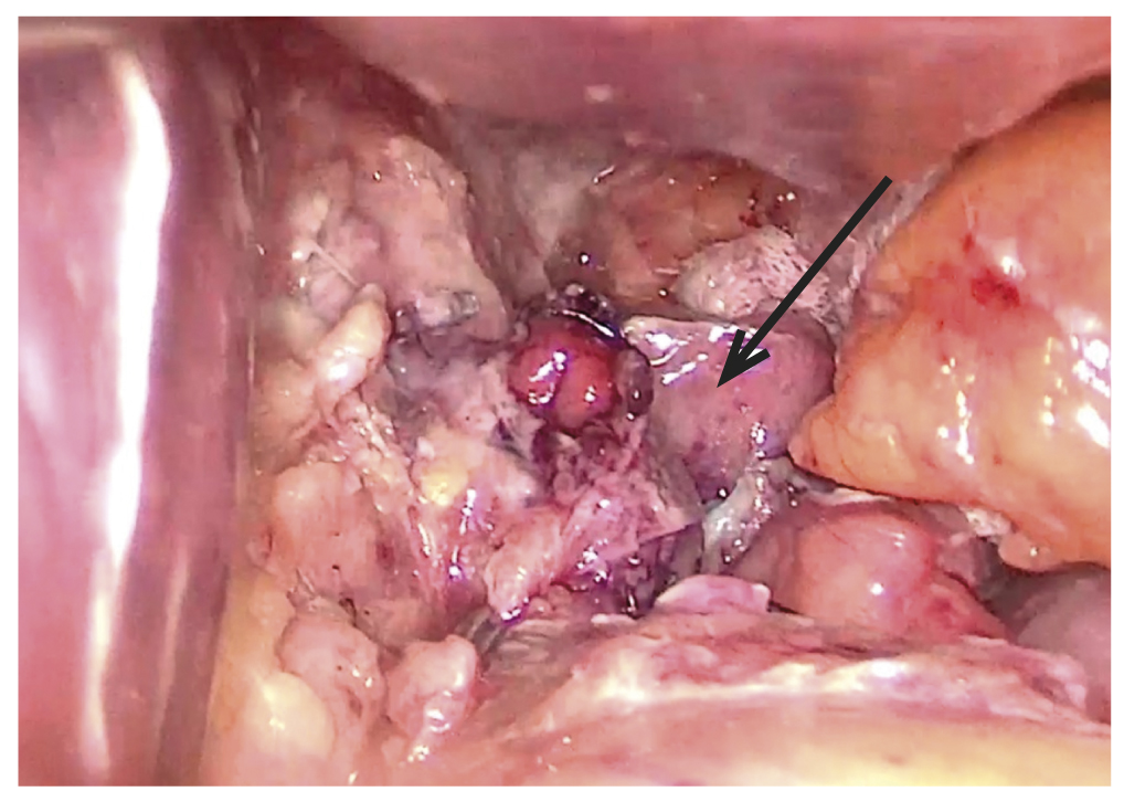 Fig. 3. Zone of gastrojejunostomy leak during revision relaparoscopy (arrow).