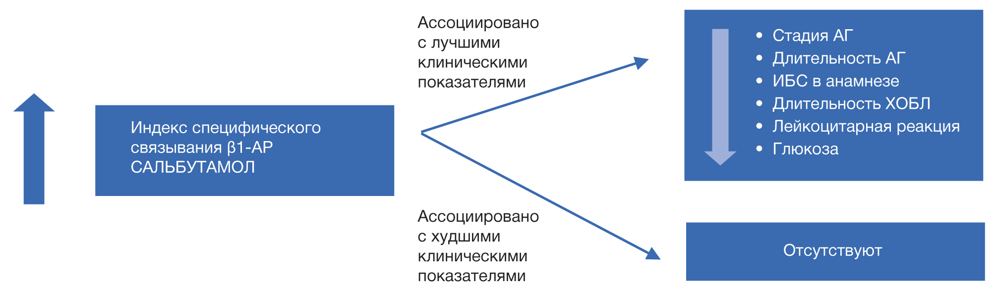 Рис. 1. Взаимосвязь повышения индекса специфического связывания β1-адренорецепторов и клинических параметров на фоне приема сальбутамола у пациентов с кардиореспираторной патологией. Примечание. β1-АР — β1-адренорецепторы; АГ — артериальная гипертензия; ИБС — ишемическая болезнь сердца; ХОБЛ — хроническая обструктивная болезнь легких. / Fig. 1. Correlation between the increase in specific binding index β1-adrenoreceptors and clinical parameters while taking salbutamol in patients with cardiovascular and bronchoobstructive diseases. Note: β1-АР — β1-adrenoreceptors; АГ — arterial hypertension; ИБС — coronary heart disease; ХОБЛ — chronic obstructive pulmonary disease.
