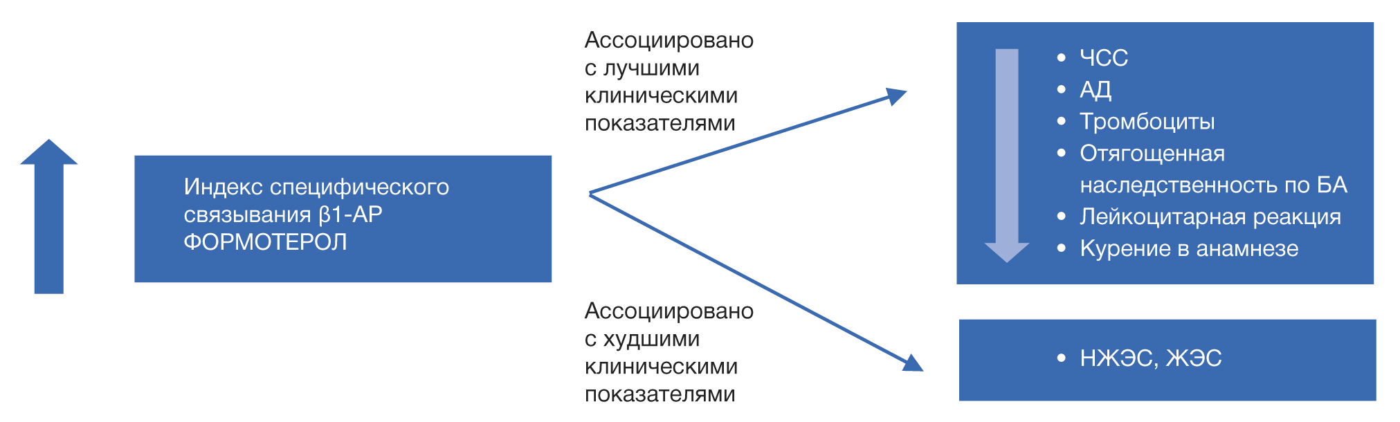 Results: The correlation analysis between clinically significant parameters and changes in the specific binding index of β1- and β2-adrenoreceptors confirmed its clinical relevance. In test with beta-agonists in cardiovascular and bronchoobstructive diseases patients, an increase in the specific binding index of β1-adrenoreceptors is associated with clinical, laboratory and instrumental parameters of a favorable course of the disease, and an increase in the specific binding index of β2-adrenoreceptors is associated with negative. In the cardiovascular group without bronchoobstructive diseases with salbutamol an increase in the specific binding index of β1-adrenoreceptors was associated with parameters of unfavorable disease course, while an increase in the specific binding index of β2-adrenoreceptors did not have a clear associative relationship with clinical characteristics.
