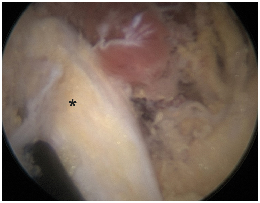 Рис. 1. Седалищный нерв (*) после выполнения невролиза.