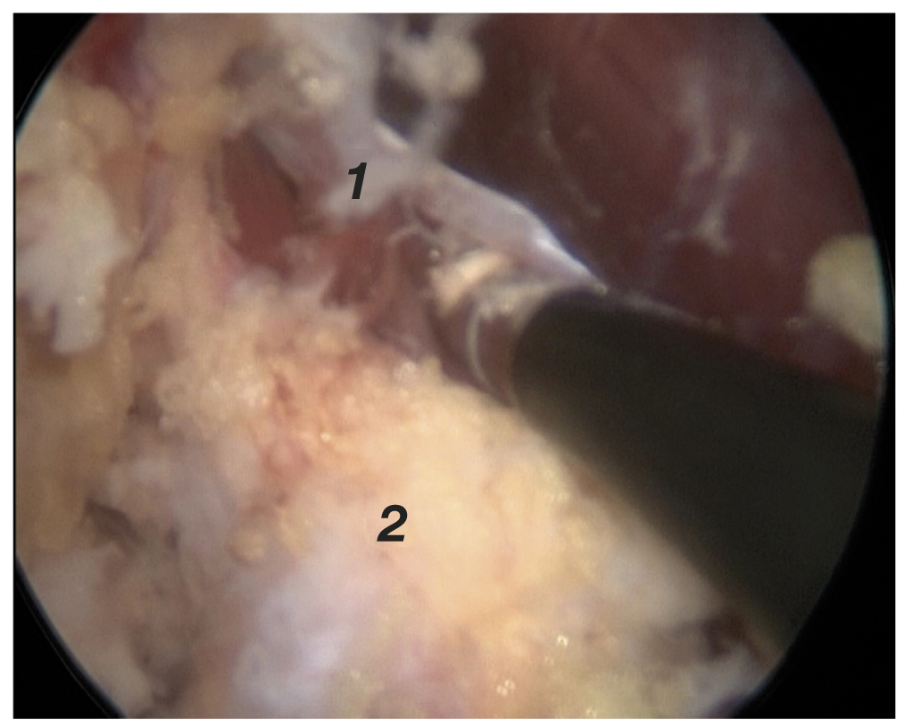 Пациентка госпитализирована в стационар для проведения хирургического вмешательства. Прооперирована в положении на животе под общим наркозом по опубликованной ранее эндоскопической методике [6, 10]. Операция выполнена эндоскопически с нагнетанием физиологического раствора с помощью артроскопической помпы. Выполнена эндоскопическая диссекция тканей в области подгрушевидного отверстия, визуализирован седалищный нерв, окружённый рубцово-спаечной тканью. Выполнены рассечение рубцово-спаечных тканей и невролиз седалищного нерва (рис. 1).