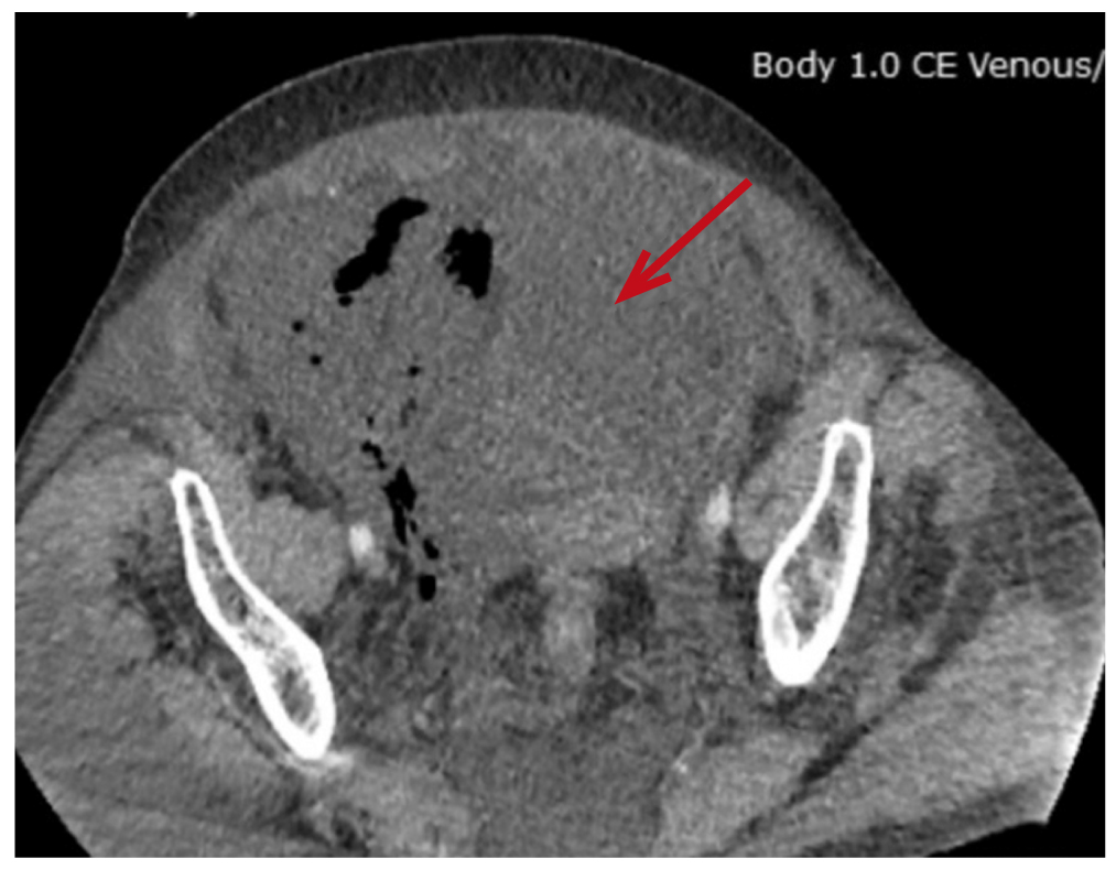 Рис. 4. Свободная жидкость в области малого таза (стрелка) по данным компьютерной томографии.