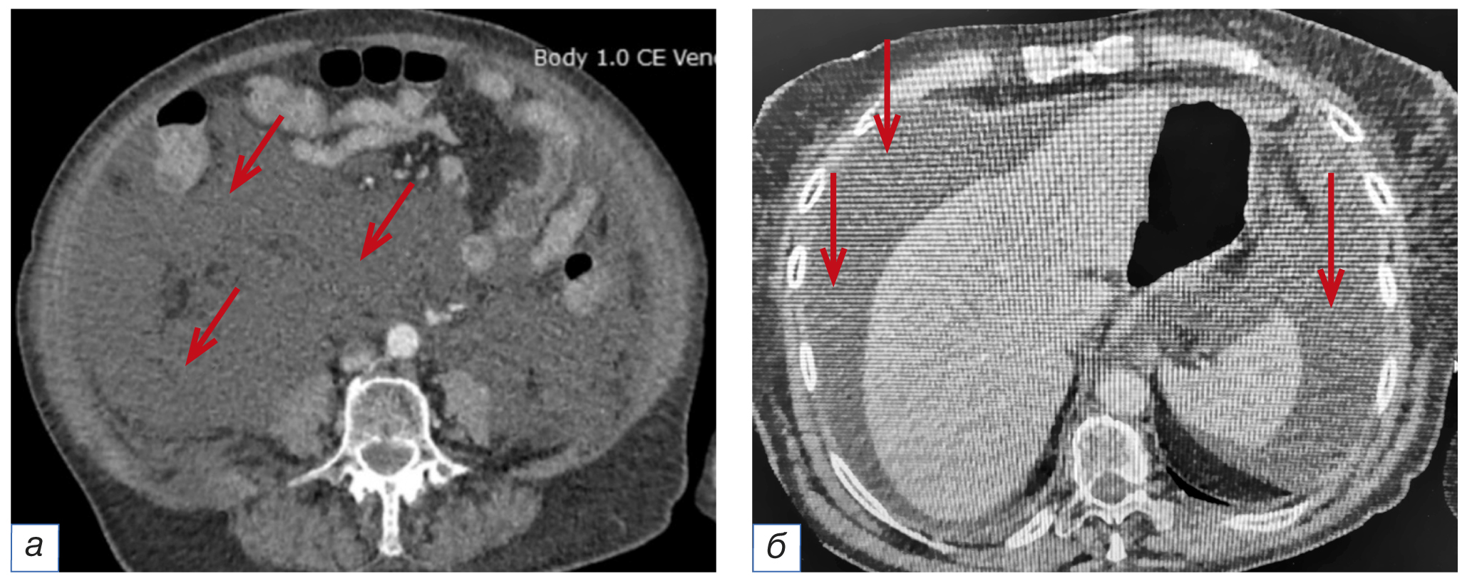 Рис. 5. Свободная жидкость в брюшной полости (стрелки на изображениях а, б) по данным компьютерной томографии.