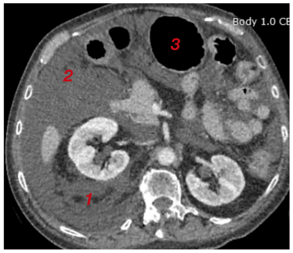 Рис. 6. Отёк забрюшинного пространства и паранефральной клетчатки справа (1); свободная жидкость в брюшной полости (2); желудок, раздутый газом (3), по данным компьютерной томографии.