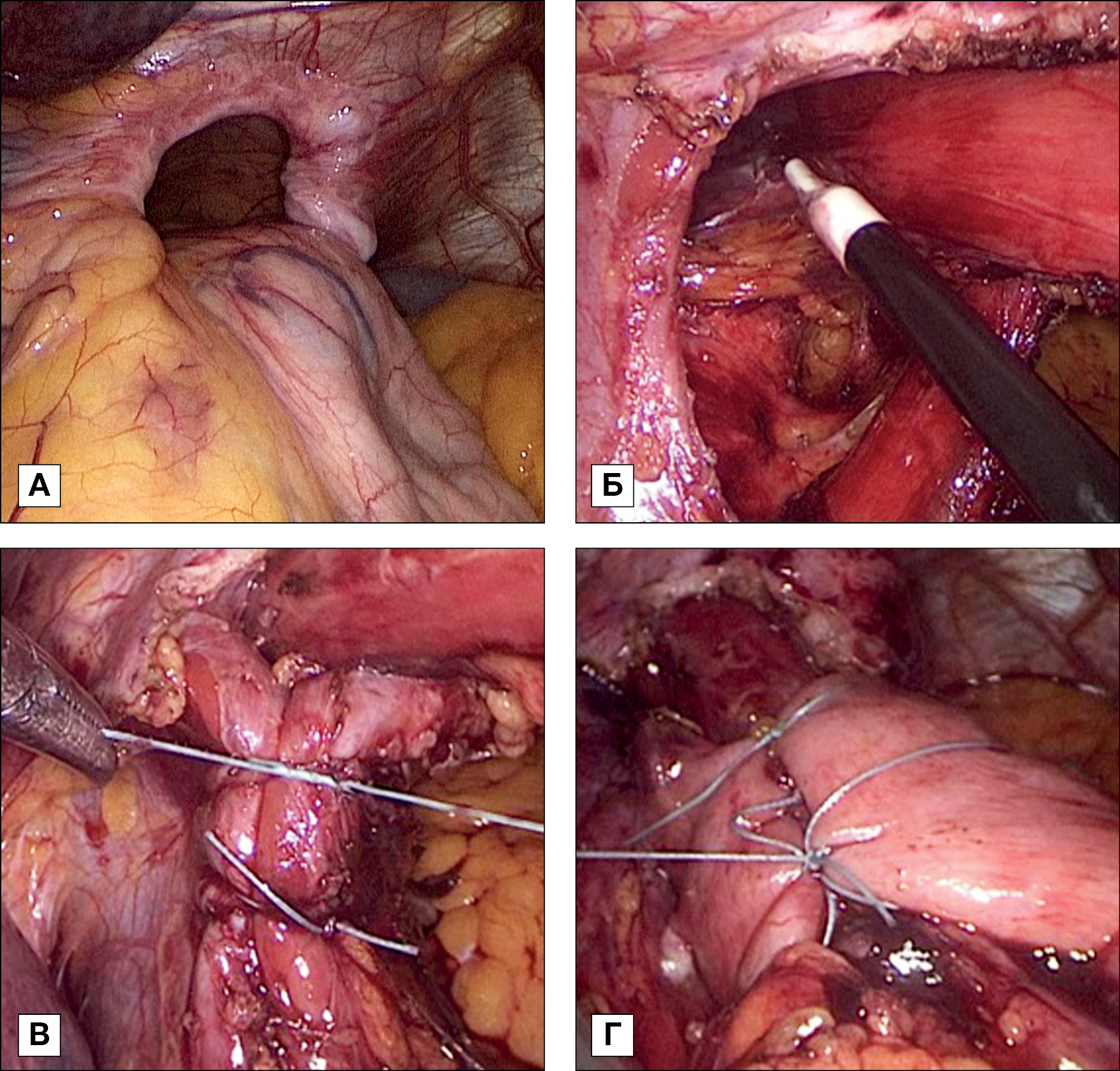 Примечание. А — грыжа пищеводного отверстия диафрагмы; Б — иссечение грыжевого мешка и мобилизация пищевода в средостении; В — ушивание дефекта пищеводного отверстия диафрагмы; Г — формирование фундопликационной манжетки.
