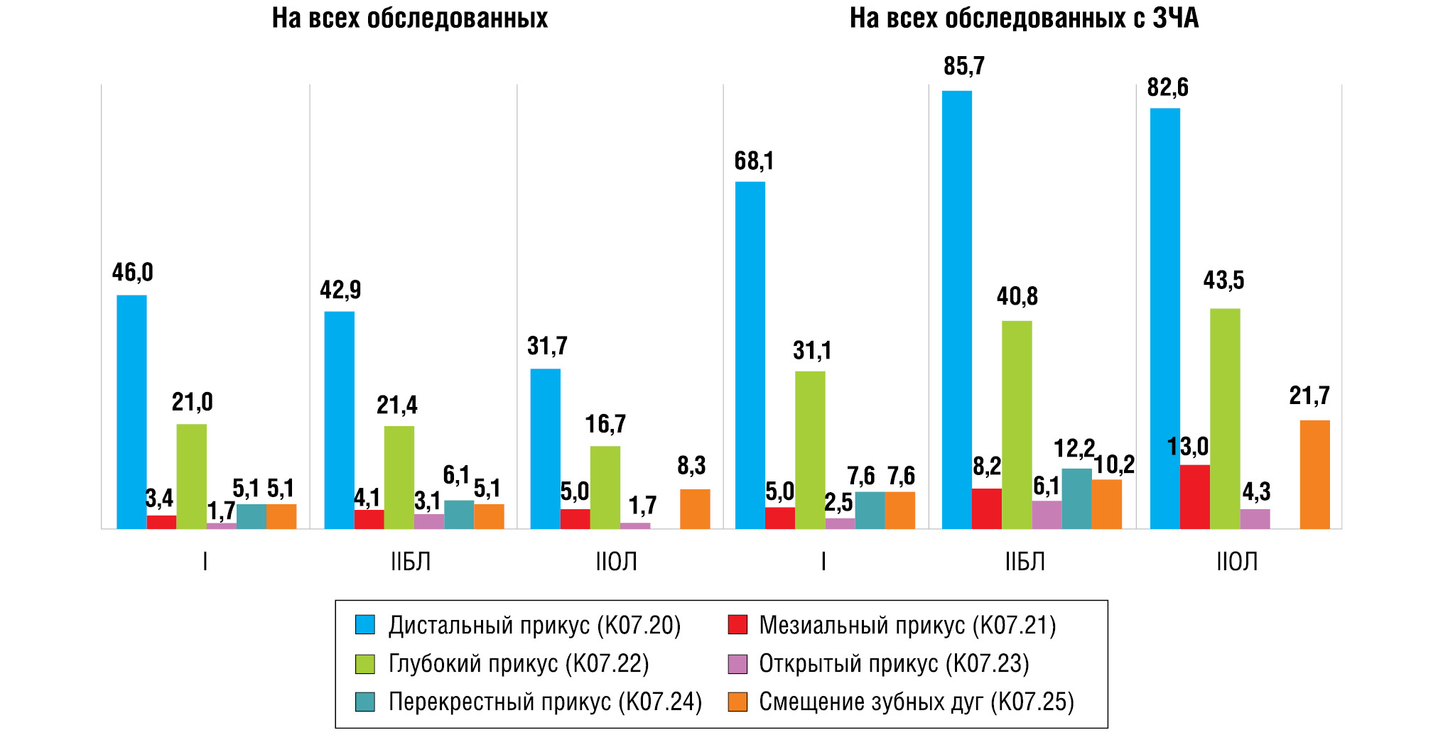 Рис. 2. Распространенность видов аномалий соотношения зубных дуг в сравниваемых группах, %