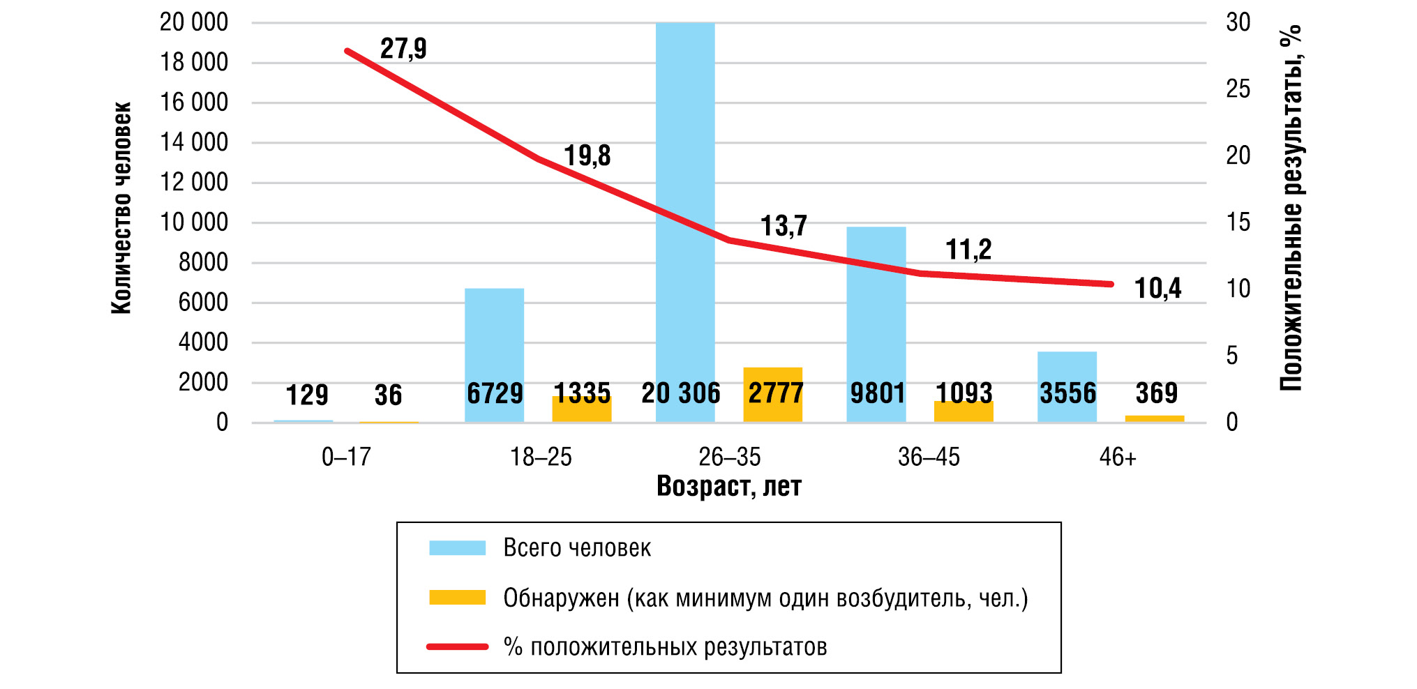 У 5610 пациентов (13,8% от общего числа) был обнаружен один и более из восьми возбудителей (рис. 1). Самый высокий процент пациентов (27,9%), у которых была обнаружена хотя бы одна инфекция, был в возрастной группе до 17 лет. Немногим менее (19,8%) — в группе 18–25 лет. Наименьшее количество положительных проб (10,4%) было отмечено в возрастной группе 46 лет и старше.
