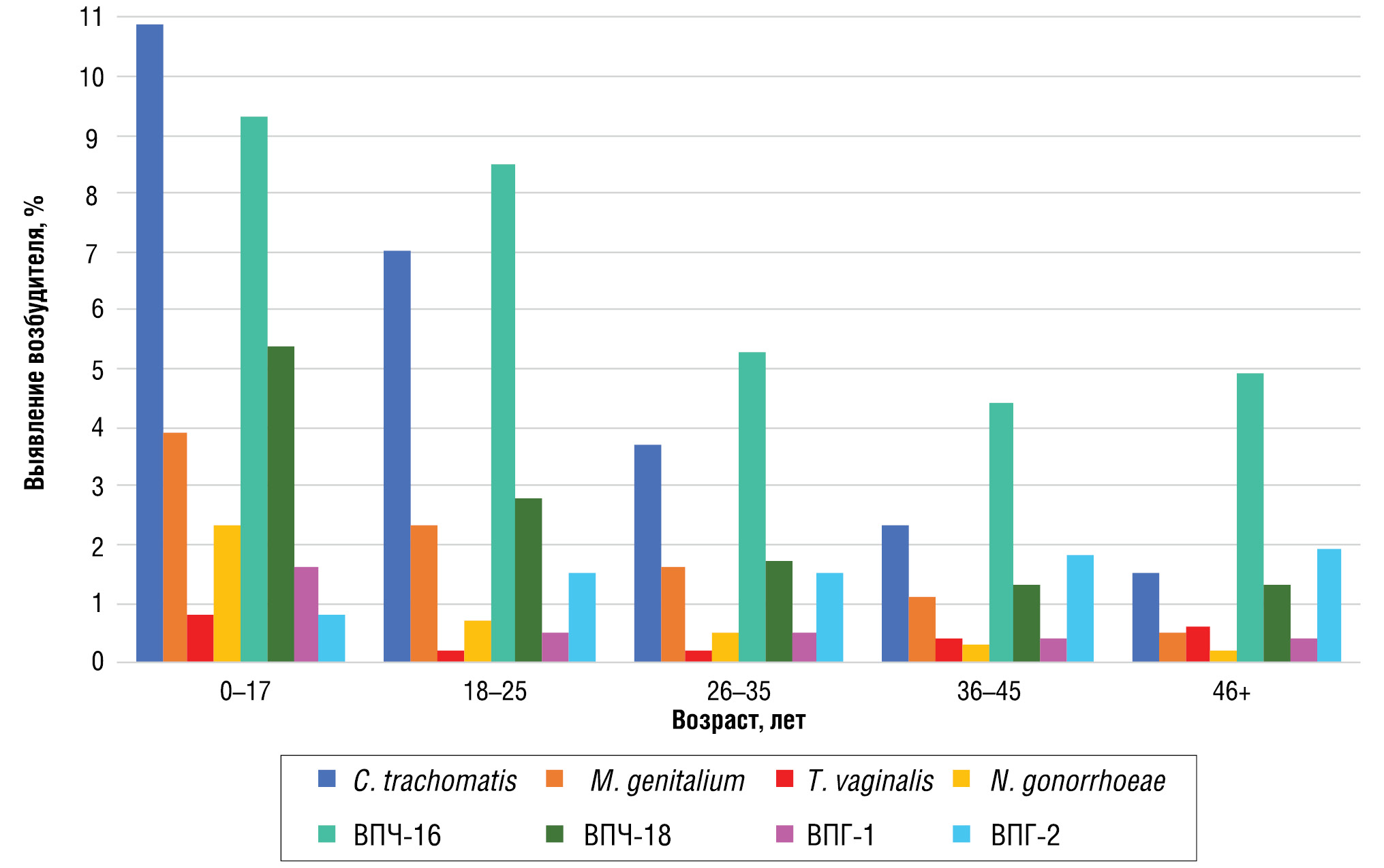 Три инфекции наиболее часто выявляются во всех возрастных группах — C. trachomatis, M. genitalium и ВПЧ высокого онкогенного риска. Лишь в отношении первых двух существуют эффективные лекарственные препараты. Несмотря на невысокие цифры, стоит обратить внимание на герпетическую инфекцию, поскольку это неизлечимое заболевание, которое значительно снижает качество жизни, а также может способствовать заражению другими ИППП и ВИЧ [6].