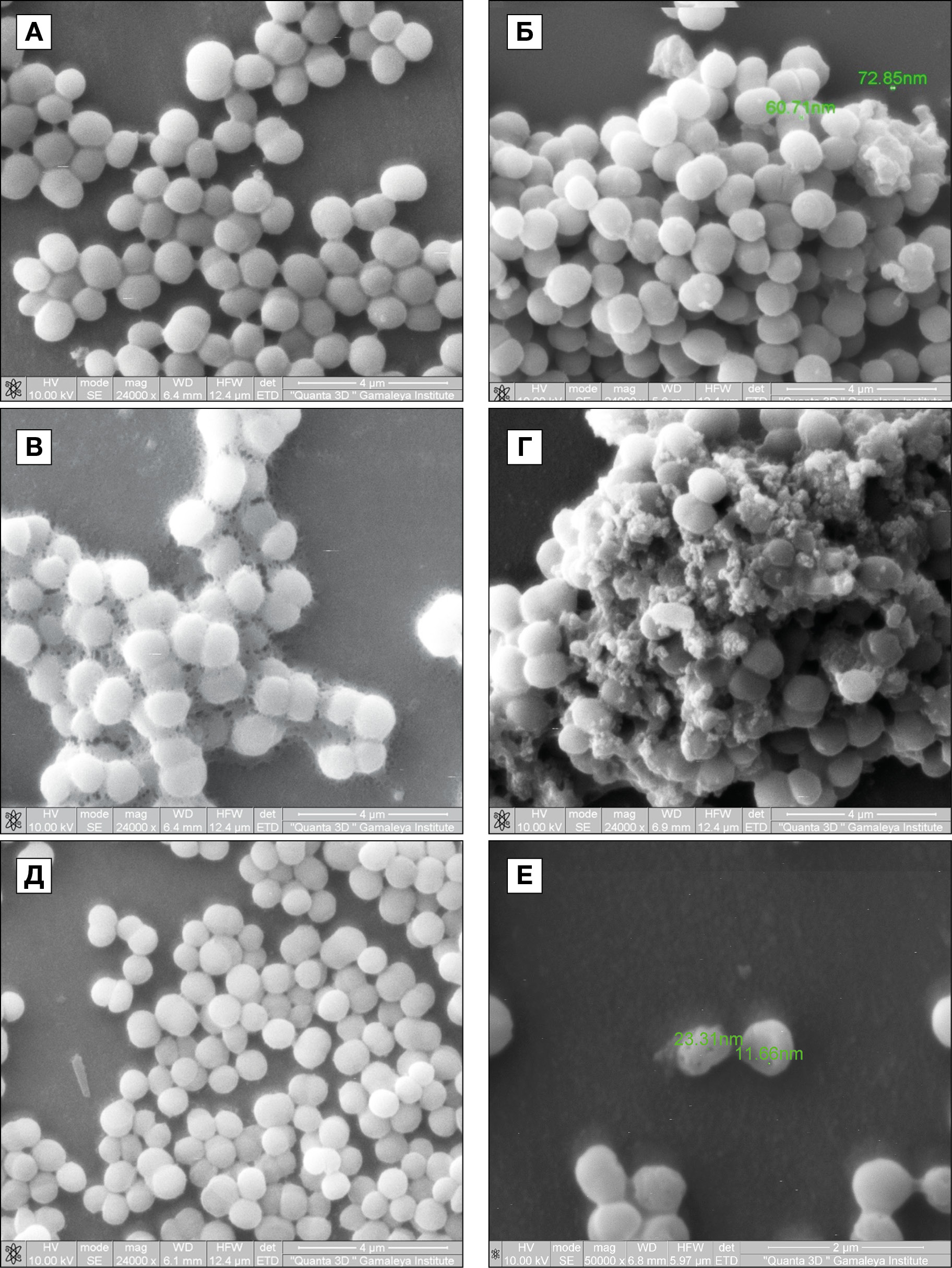 Примечание. Морфология клеток антибиотикочувствительного S. hominis без (А) и при воздействии антисептика 500 мкг/мл в течение 15 мин (Б); полирезистентных S. hominis (В, Г) и S. epidermidis (Д, Е) без (В, Д) или при воздействии антисептика 31,25 мкг/мл в течение 60 мин (Г, Е).