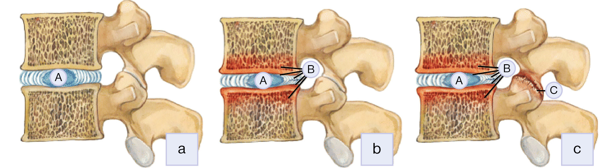 Примечание. Дегенеративный процесс начинается с пульпозного ядра межпозвонковых дисков (a), далее распространяется на фиброзное кольцо, замыкательные пластинки, костный мозг смежных тел позвонков (b), позже охватывает отдаленные структуры и приводит к фасеточному синдрому (c), гипертрофии желтой связки, спинальному стенозу. А — пульпозное ядро, В — фиброзное кольцо, С — дугоотростчатый сустав.