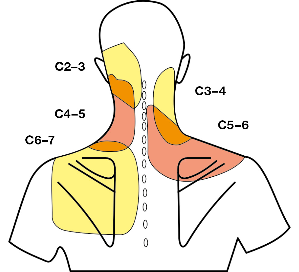 Рис. 2. Схема зон распространения боли при фасет-синдроме шейного отдела позвоночника (по Aprill C, Bogduk N, 1992).