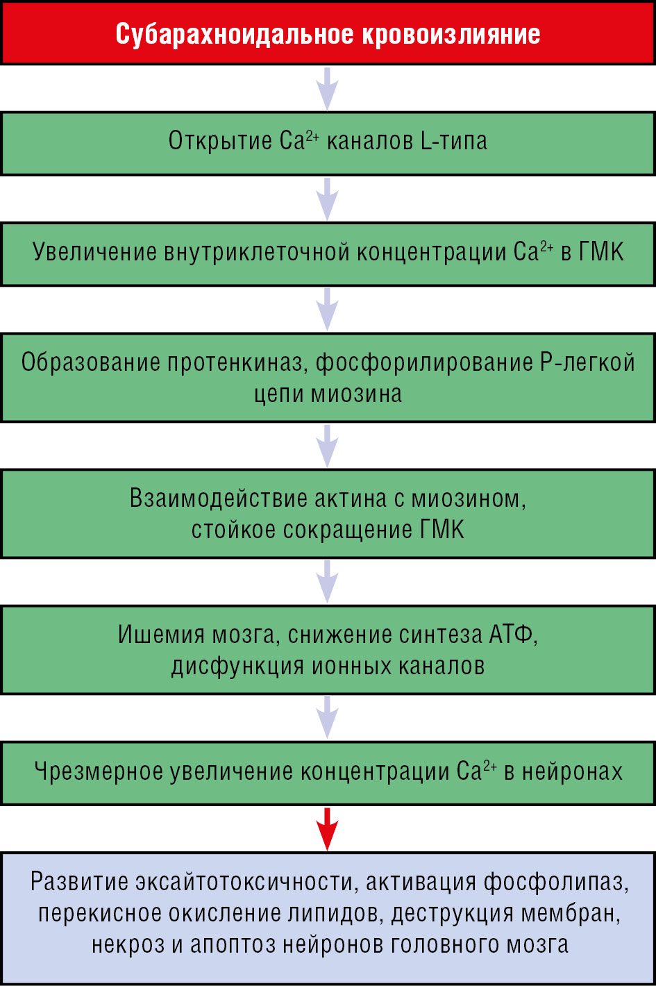 Высокая концентрация кальция в гладкомышечных клетках способствует чрезмерному образованию комплексов Са2+–кальмодулин, Са2+–фосфолипид и протеинфосфокиназ, которые через цепь реакций приводят к развитию сосудистого спазма и ишемии головного мозга (рис. 1) [15, 16].