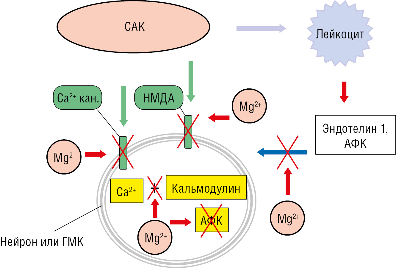Ионам магния отводится важная роль в процессах, происходящих в тканях головного мозга и гладкомышечных клетках. Так, известно, что магний блокирует кальциевые каналы L-типа и НМДА (Н-метил-Д-аспартат) каналы, снижает концентрацию ионов кальция в нейронах и гладкомышечных клетках. Ионы магния, уменьшая концентрацию Са2+ в гладкомышечных клетках, способствуют снижению уровня протеинфосфокиназ. Доказана роль сульфата магния в восстановлении антиоксидантной системы организма. Так, по мнению M. Üstün и соавт. [39], введение препаратов магния больным в остром периоде субарахноидального кровоизлияния на фоне разрыва церебральных аневризм приводит к увеличению количества антиоксидантов в тканях головного мозга, таких как супероксиддисмутаз и глутатионпероксидаз. Также показано, что магний блокирует действие норадреналина, ангиотензина 2, серотонина, эндотелина 1 и снижает образование свободных радикалов [40–42] (рис. 2).