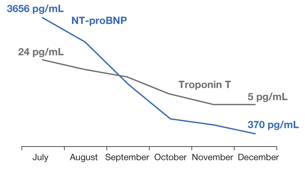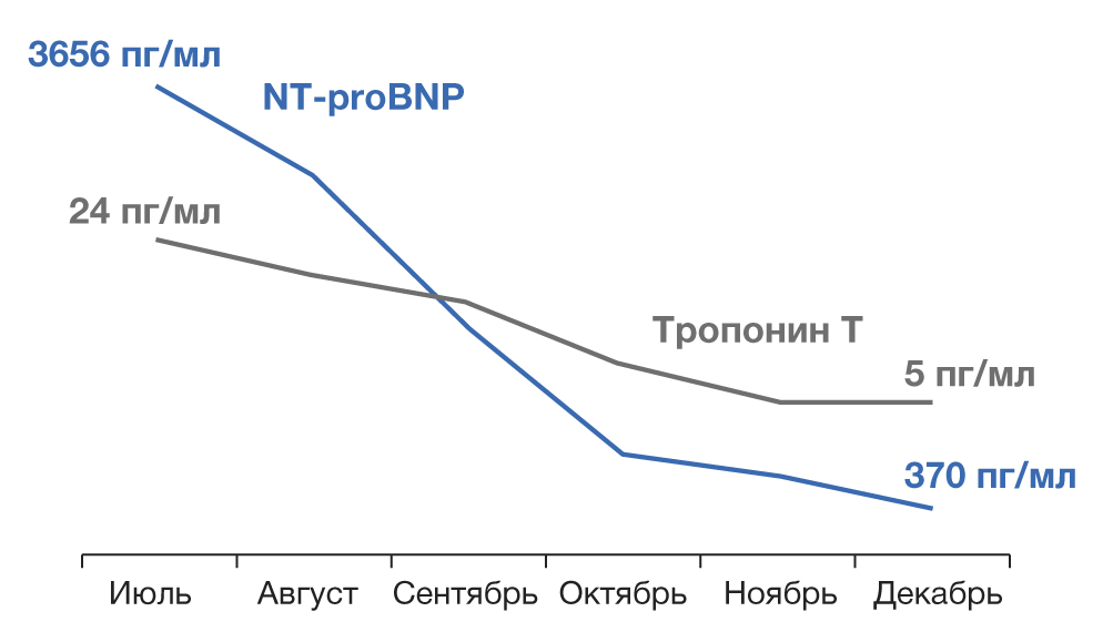 Treatment, dynamics, and outcomes: During the cardio-oncology conference, the patient’s treatment plan was discussed. It was determined that radical surgery or neoadjuvant therapy with cardiotoxic drugs would be unwarranted because of the high risk of cardiac complications. Immunotherapy was recommended. The patient was initially treated with sacubitril + valsartan at a dose of 50 mg twice a day, carvedilol 6.125 mg twice a day, and furosemide 40 mg twice a day. The patient was prescribed sacubitril + valsartan 200 mg twice daily (with a maximum daily dose of 2.5 months), carvedilol 12.5 mg twice daily, eplerenone 25 mg daily, torasemide 5 mg daily, and atorvastatin 20 mg daily (Fig. 1). Following the initial consultation, the optimal dosage was titrated over a period of 1.5 months. The doses of sacubitril + valsartan and beta-blockers were gradually increased owing to the patient’s tendency to hypotension. Empagliflozin was added to the therapy at a dose of 10 mg daily from the first month of treatment. In August 2020, the patient began therapy with the immune response checkpoint inhibitor pembrolizumab. Treatment, laboratory, and instrumental studies were conducted at the patient’s place of residence, and cardiologist consultations were conducted remotely. Treatment monitoring was performed with the participation of family members. During therapy, the signs of heart failure improved. The LVEF increased to 45%, and the levels of cardiac markers decreased (troponin T up to 5 pg/mL, NT-proBNP to 370 pg/mL) (Fig. 2). The patient received the prescribed immunotherapy for 10 months.