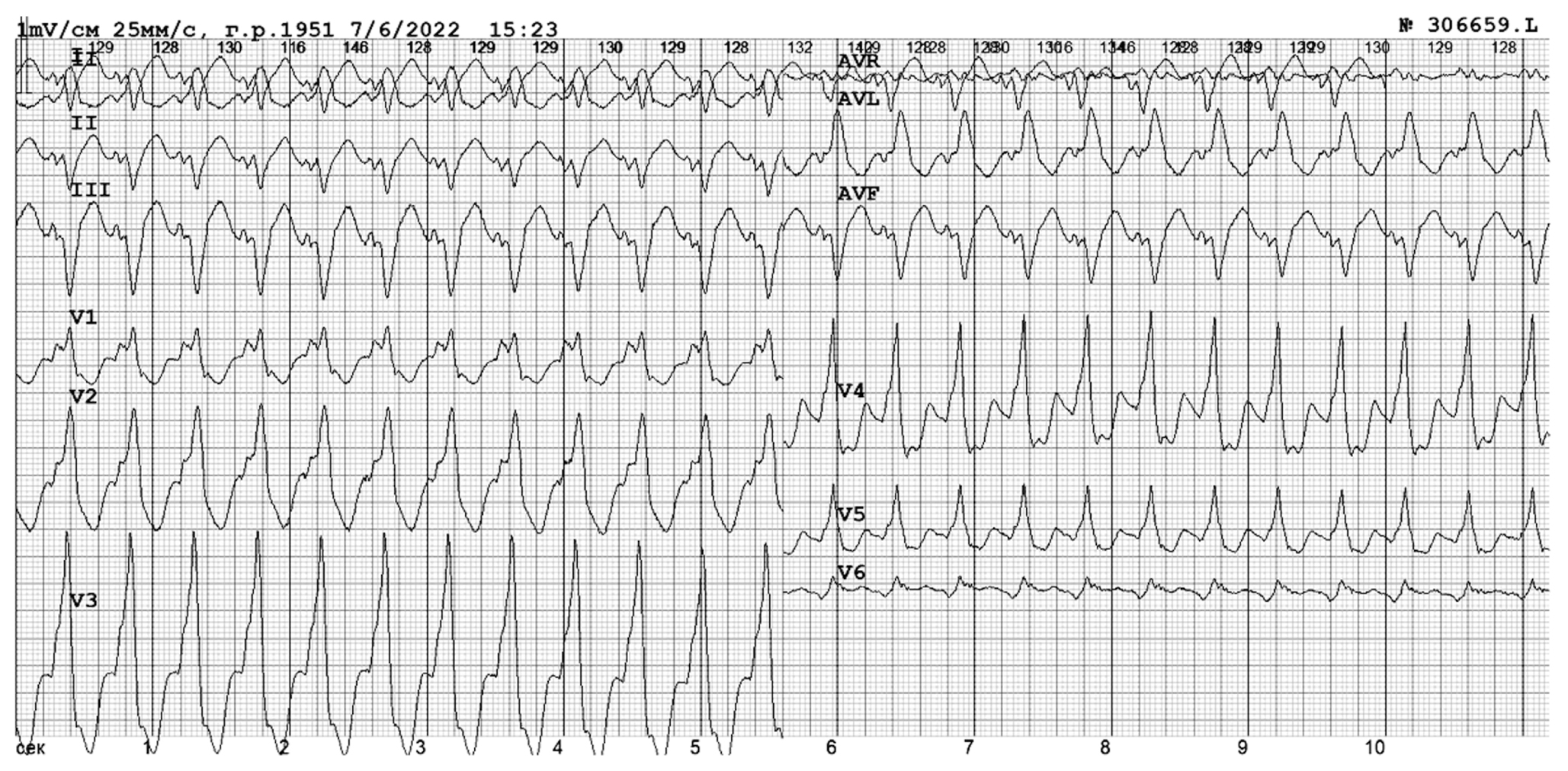 The combined use of antiarrhythmic drugs from groups 1 and 3 was ineffective. Therefore, on August 16, 2022, an intracardiac electrophysiological study and radiofrequency ablation of ventricular extrasystole/tachycardia were performed under intracardiac ultrasound control (without fluoroscopy). The postoperative course was smooth. The patient was discharged on postoperative day 3 (Fig. 4). At the follow-up examination on September 28, 2022, no paroxysms of ventricular tachycardia were detected, and signs of heart failure did not increase. The patient’s LVEF was 35%, and the level of atrial natriuretic peptide was 525 pg/mL. The therapy was continued with spironolactone, dapagliflozin, carvedilol, atorvastatin, and rivaroxaban. Because of persistent hypotension, sacubitril + valsartan was temporarily discontinued and restarted 2 months later.