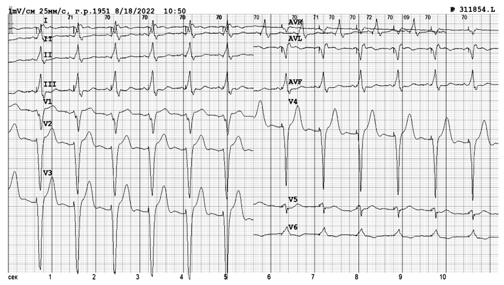 Patient’s data: Patient I, a 71-year-old male, had a history of Q-shaped myocardial infarction of inferior localization in 2002, followed by mammary–coronary and aortocoronary bypass surgery in 2003. He experienced a repeated myocardial infarction of inferolateral localization on January 06, 2021. The patient had risk factors for coronary heart disease, including arterial hypertension and dyslipidemia and has a history of alcohol abuse. In February 2020, the patient sought medical attention from the Federal Medical and Biological Agency of Russia.