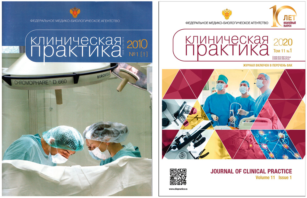 Обложки первого и текущего выпусков журнала «Клиническая практика»