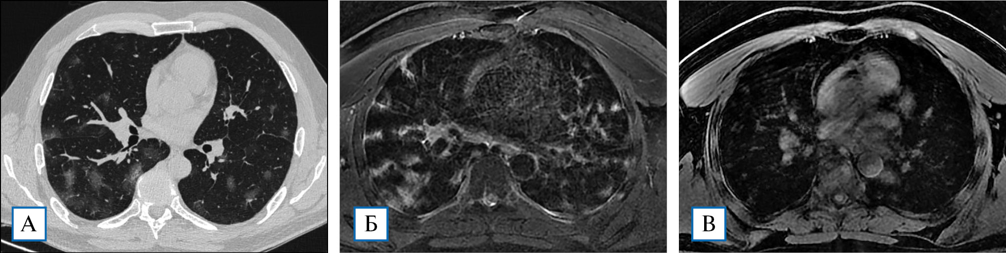 Рис. 1. Пациент, 53 года, выявляются множественные участки «матового стекла», расположенные во всех долях, преимущественно перибронховаскулярно, с нечеткими контурами — стадия КТ2 (А); аналогичные по размерам, количеству и локализации гиперинтенсивные участки визуализируются на Т٢-сканах, полученных с помощью импульсной последовательности PROPELLER FS (Б); на Т1-ВИ описанные выше изменения практически не видны (В)