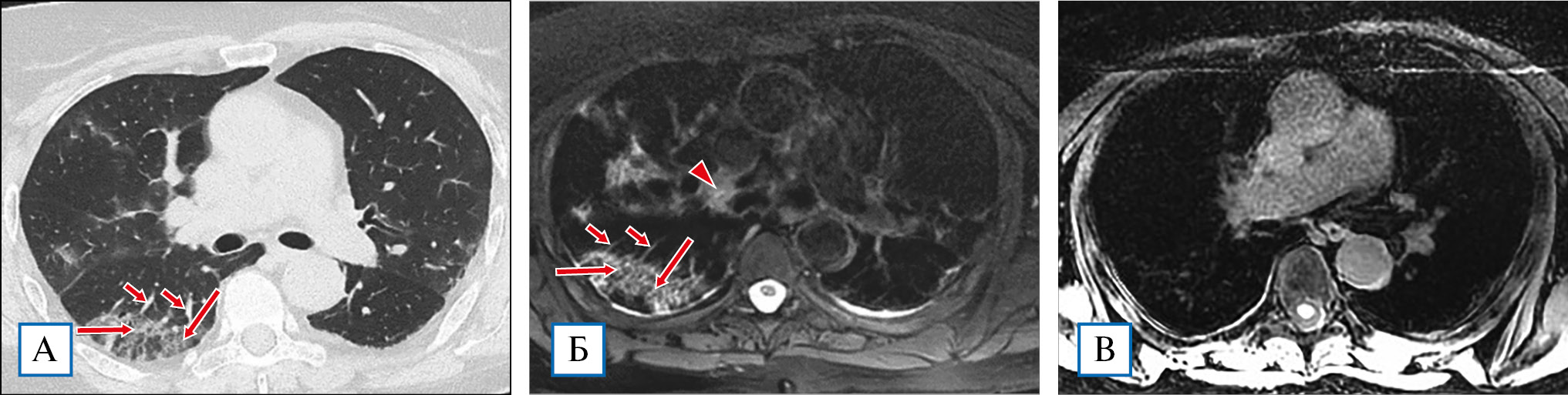 Рис. 5. Пациент, 56 лет, тяжелое течение COVID 19. При КТВР констатировано наличие множественных среднего размера зон консолидации в различных сегментах легких, преимущественно перибронховаскулярной и субплевральной локализации (А). При МРТ в нижней доле правого легкого наряду с гиперинтенсивными зонами по Т2 (В, стрелка) выявлялись разнокалиберные очаги повышенного сигнала на Т1-ВИ (Б, стрелки). Обнаруженные изменения расценены как альвеолярные геморрагии