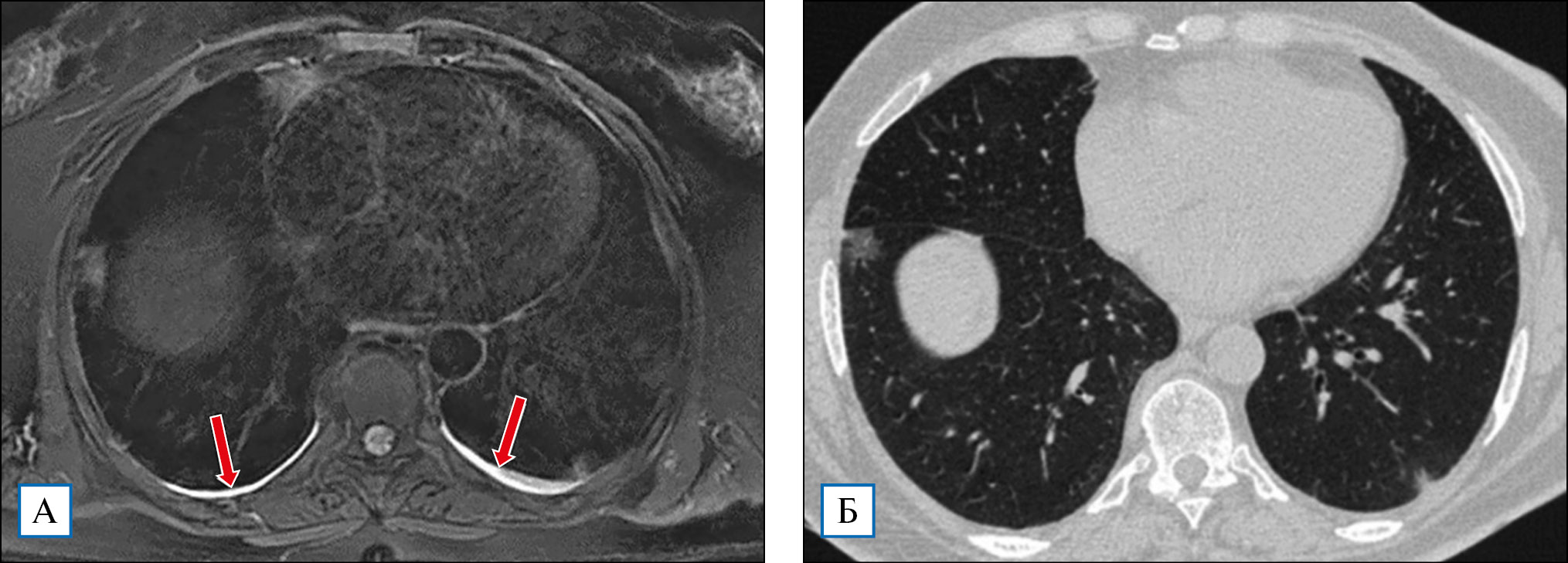 Рис. 4. Т2-ВИ МРТ имеет заметные преимущества в сравнении с КТВР в выявлении небольших объемов жидкости в плевральных полостях. Малый двусторонний гидроторакс у пациентки Б., 69 лет (стадия КТ1), уверенно выявляется на Т2 МРТ (стрелки, А) и практически не отображается на КТВР-срезах (Б)