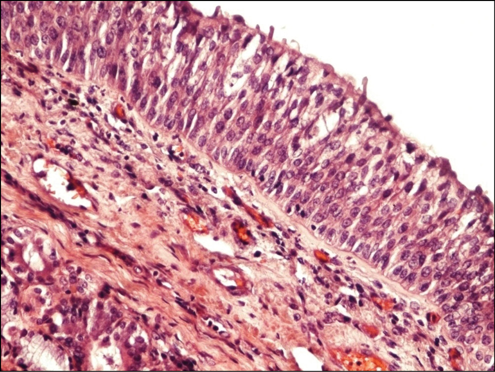 Рис. 1. Базальноклеточная гиперплазия эпителия трахеи. Окраска гематоксилином и эозином, ×100