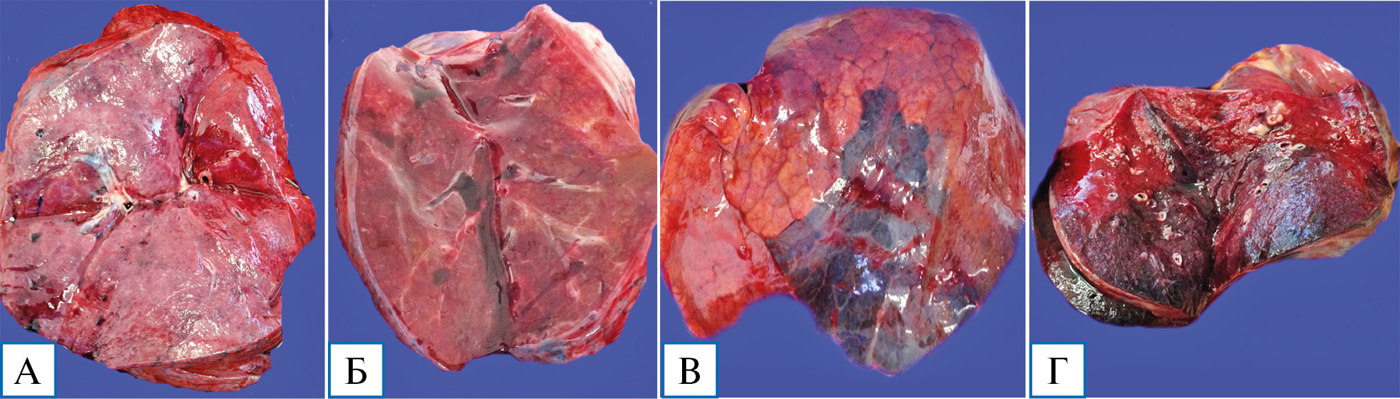 В 12 случаях летального исхода в течение 10 сут от начала заболевания макроскопически легкие были увеличены, тяжелые, тестоватой или плотной консистенции, маловоздушные, на разрезе с обширными участками «лакированного» вида, темно-красного (вишневого) цвета (рис. 2, А, Б). Присутствовали участки неравномерной окраски с чередованием сероватых, светло-багровых очагов, резко выраженного отека. В 5 случаях (смерть от 7 до 10 сут от начала заболевания) также отмечались единичные очаги зернистого вида, серовато-желтого цвета, и четко определялись участки геморрагических инфарктов правильной треугольной формы (рис. 2, В, Г) с наличием обтурирующих тромбов в сегментарных и субсегментарных ветвях легочных артерий.