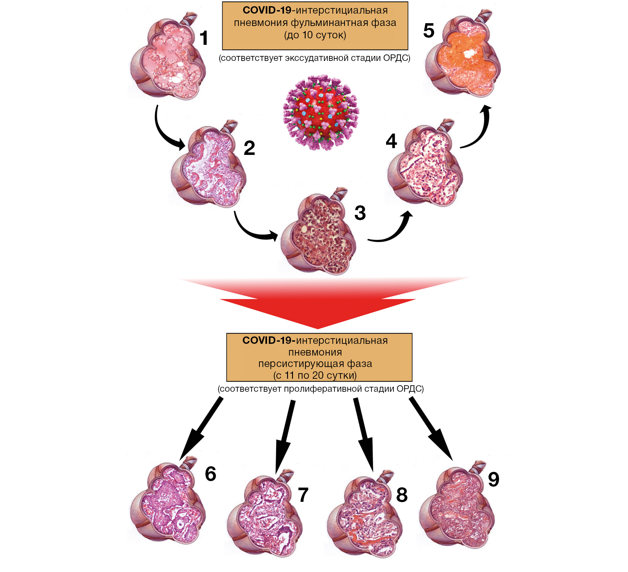 Рис. 3. Патоморфологические фазы COVID-19-интерстициальной пневмонии, соответствующие экссудативной (1–5) и пролиферативной (6–9) стадиям острого респираторного дистресс-синдрома (обозначения 1–9 приведены в тексте) [иллюстрация Ф.Г. Забозлаева]
