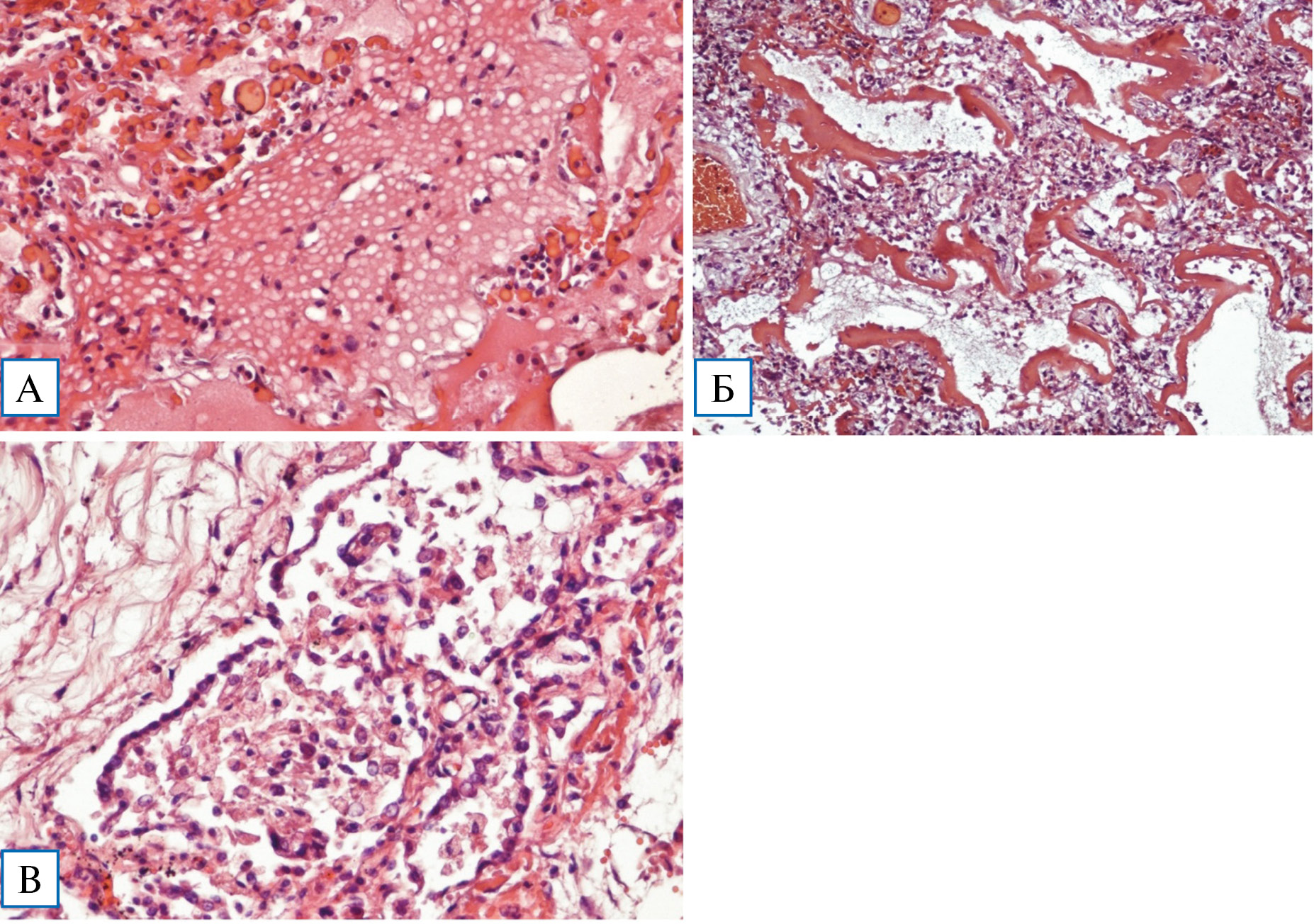 Примечание. А — внутриальвеолярный отек с процессами его резорбции; стазы в мелких капиллярах межальвеолярных перегородок; Б — сформированные гиалиновые мембраны; интерстициальный отек межальвеолярных перегородок со слабовыраженной круглоклеточной инфильтрацией; В — пролиферация альвеолоцитов 2-го типа с их десквамацией и денудацией базальной мембраны; десквамированные альвеолоциты и легочные макрофаги в просвете альвеол; выраженный интерстициальный отек.