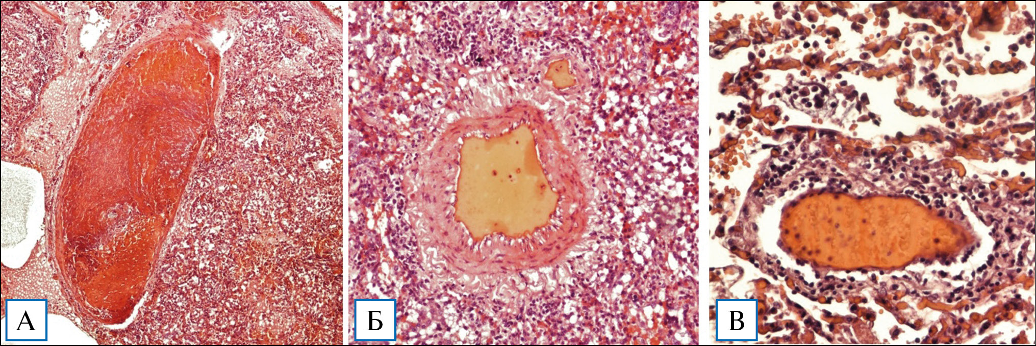 Примечание. А — фибриново-эритроцитарный тромб в мелкой ветви легочной артерии, ×40; Б — отек субэндотелиального слоя с гиперплазией мышечных клеток медиального слоя; периваскулярная воспалительно-клеточная реакция, ×100; В — посткапиллярный венулит с диффузной лимфоидной инфильтрацией, ×200.