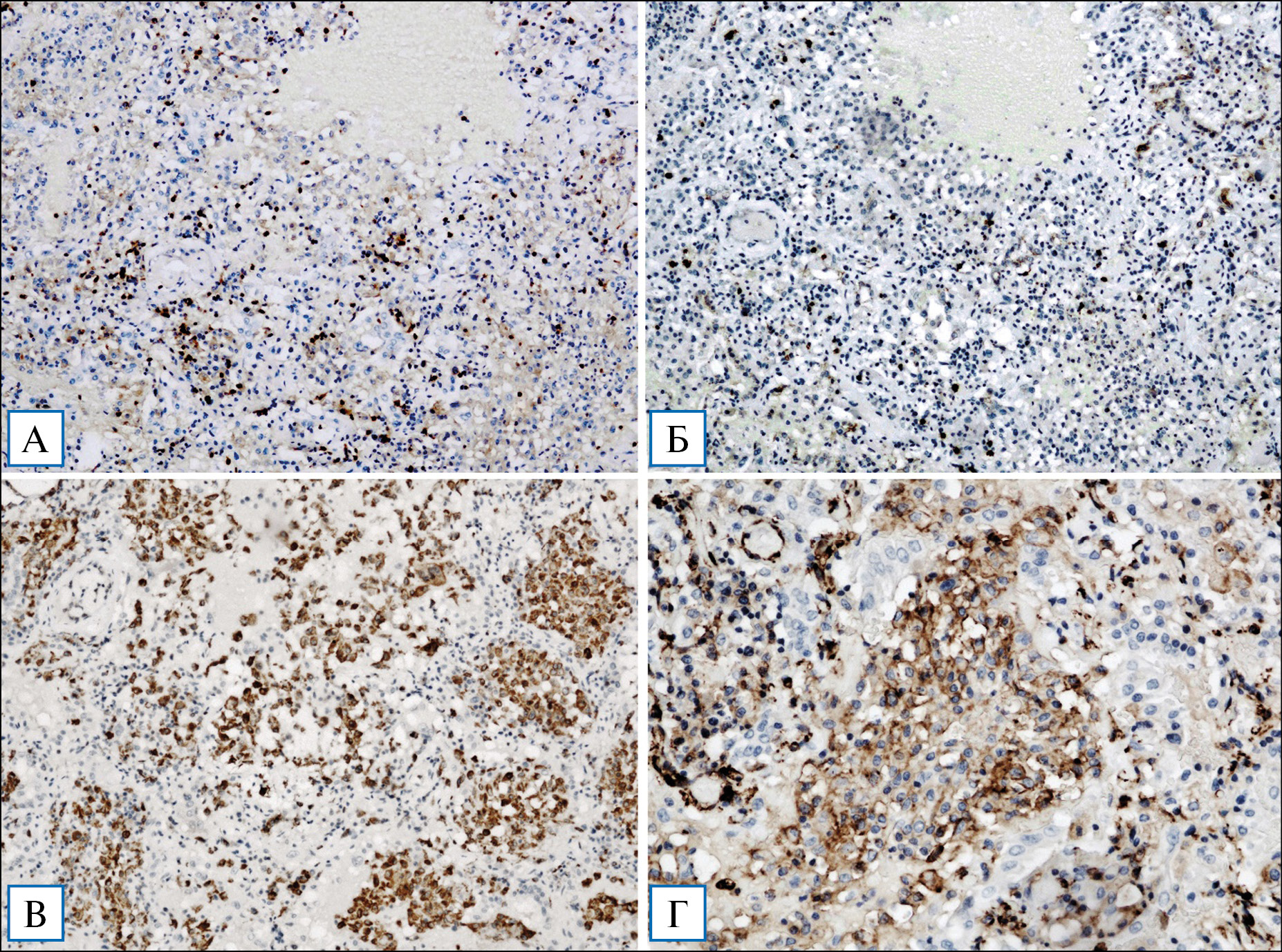 Примечание. А — экспрессия CD4 Т-лимфоцитами-хелперами, ×100; Б — экспрессия CD8 Т-лимфоцитами-супрессорами, ×100; В — экспрессия CD68, ×100; Г — экспрессия CD31 (PECAM-1), ×200.