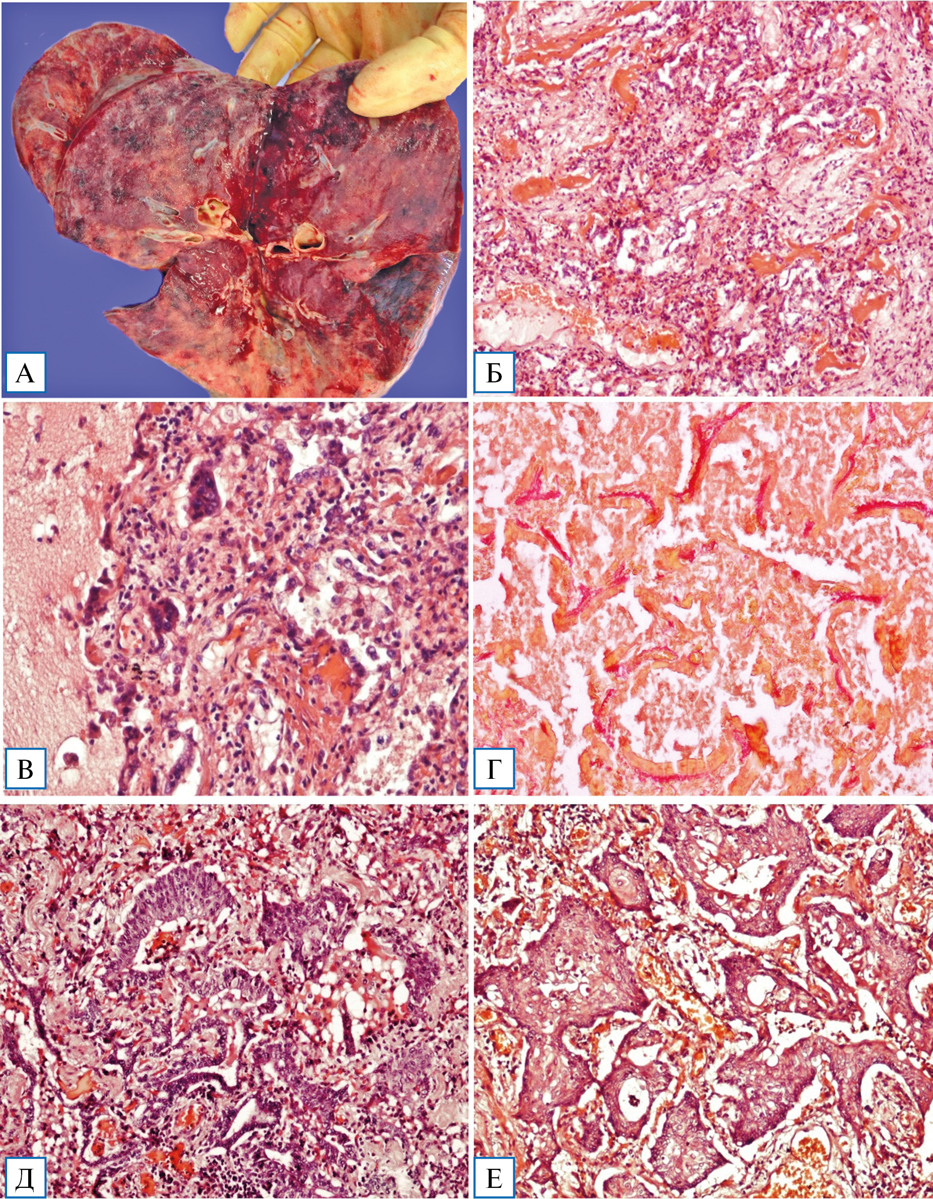 Примечание. А — «порфировое» легкое; Б — участки деформированной альвеолярной паренхимы с гиалиновыми мембранами, врастанием грануляционной ткани в респираторные бронхиолы, альвеолярные ходы и альвеолы; В — внутриальвеолярный отек, макрофаги и десквамированные альвеолоциты с формированием мультинуклеарных структур, моноциты; Г — слабо-/умеренно выраженный периваскулярный фиброз; Д, Е — гиперплазия альвеолярного и бронхиолярного эпителия с участками плоскоклеточной метаплазии и реактивной дисплазии.