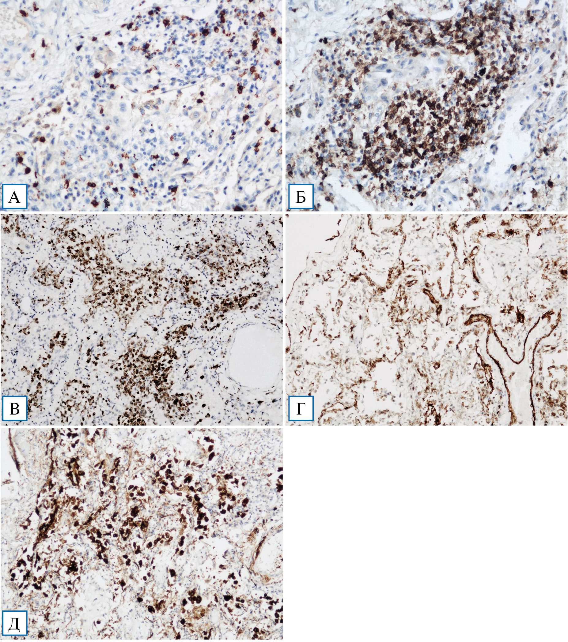 Примечание. А — экспрессия CD4 Т-лимфоцитами-хелперами, ×200; Б — экспрессия CD8 Т-лимфоцитами-супрессорами, ×200; В — экспрессия CD68, ×100; Г — экспрессия CD31 (PECAM-1), ×200; Д — экспрессия сурфактантассоциированного белка А, ×100.
