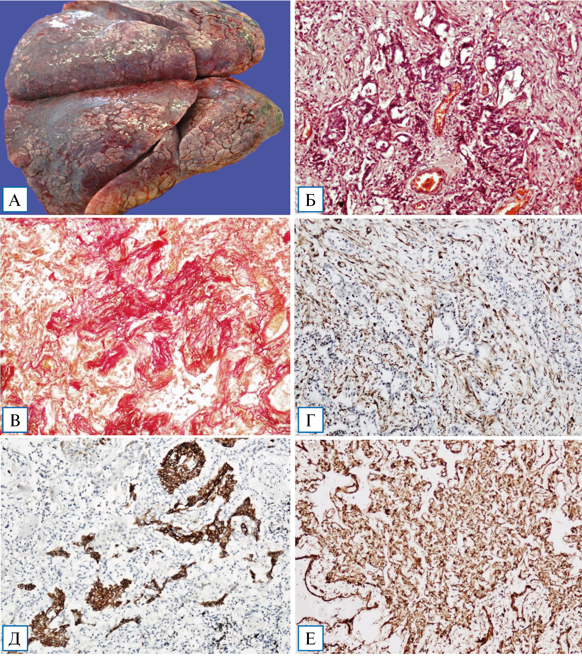 Примечание. А — макропрепарат легких: прилежащая к участкам фиброза висцеральная плевра легкого с мелкобугристой поверхностью, визуально напоминает капсулу цирротически измененной печени; Б — пролиферативные, гиперпластические и метапластические изменения бронхиального и альвеолярного эпителия с формированием аденоматозных структур, очагов плоскоклеточной метаплазии с фокусами ороговения и реактивной дисплазии; В — диффузный фиброз легочной паренхимы при фибротической фазе COVID-19-интерстициальной пневмонии; Г — экспрессия гладкомышечного актина (actin, smooth muscle) пролиферирующих миофибробластов; Д — экспрессия Cytokeratin 5 & 6 в очагах плоскоклеточной метаплазии; Е — экспрессия коллагена IV типа.