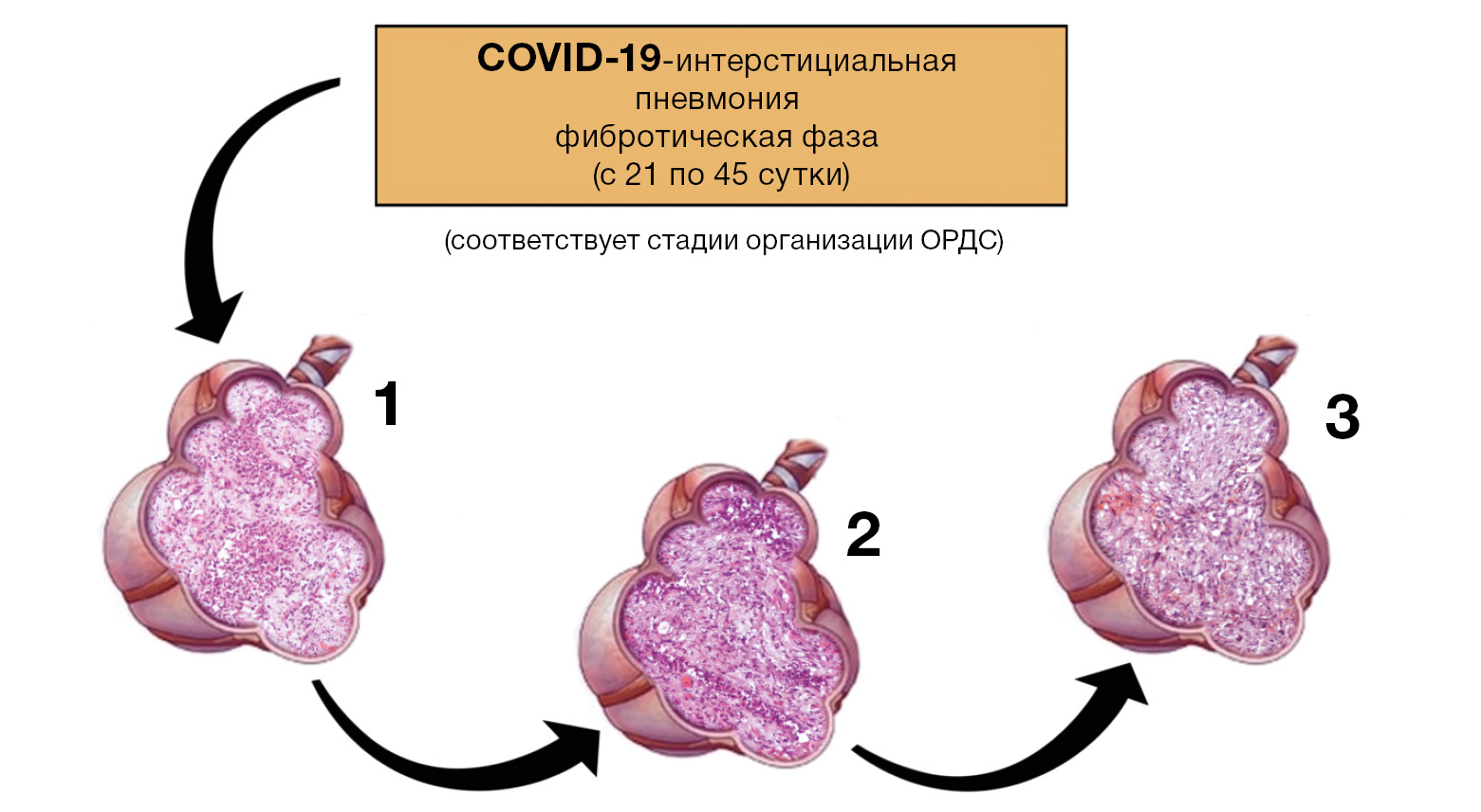 При гистологическом исследовании — структурная дезорганизация паренхимы легкого с изменением нормальной гистоархитектоники за счет быстропрогрессирующего фиброза. Альвеолы преимущественно коллабированы (ателектазы и дистелектазы) с единичными щелевидными просветами (рис. 10, схематическое изображение 1–3). Межальвеолярные перегородки резко утолщены за счет отложения коллагеновых волокон с фокусами пролиферации фибробластов и миофибробластов, редукцией капиллярного русла, диффузной инфильтрацией макрофагами, полиморфно-ядерными лейкоцитами и немногочисленными лимфоцитами. Эпителиальная выстилка деформированных межальвеолярных перегородок представлена пролиферирующими альвеолоцитами 2-го типа, с признаками резко выраженных реактивных и дисрегенераторных изменений.