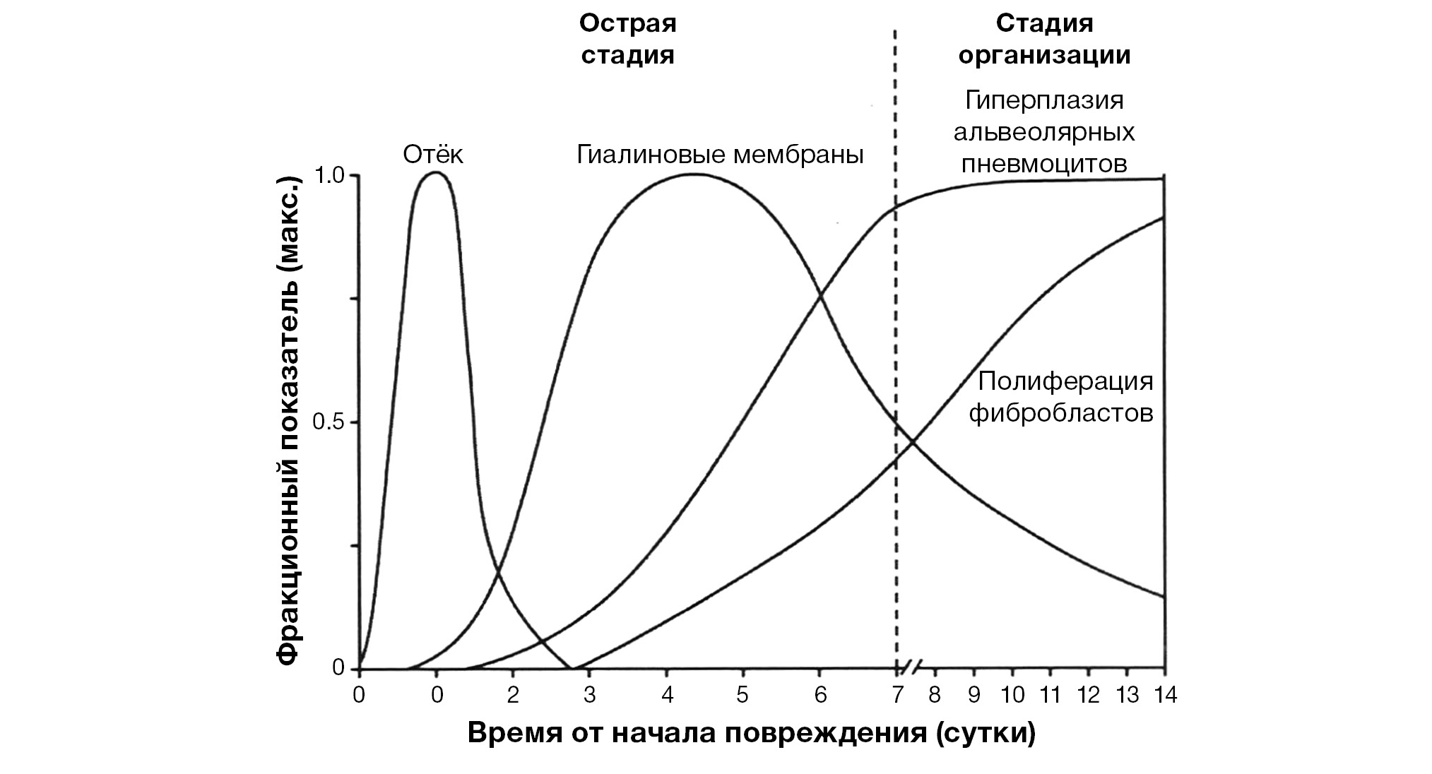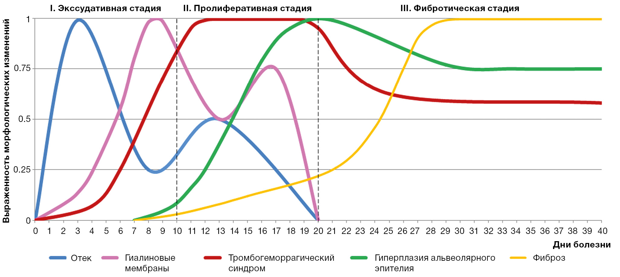 Острый респираторный дистресс-синдром при СOVID-19-интерстициальной пневмонии отличается от классической схемы развития диффузного альвеолярного повреждения, модифицированной в 2016 г. [32]. Согласно данной схеме, диффузное альвеолярное повреждение включает 2 стадии общей продолжительностью около 14 дней (рис. 11).