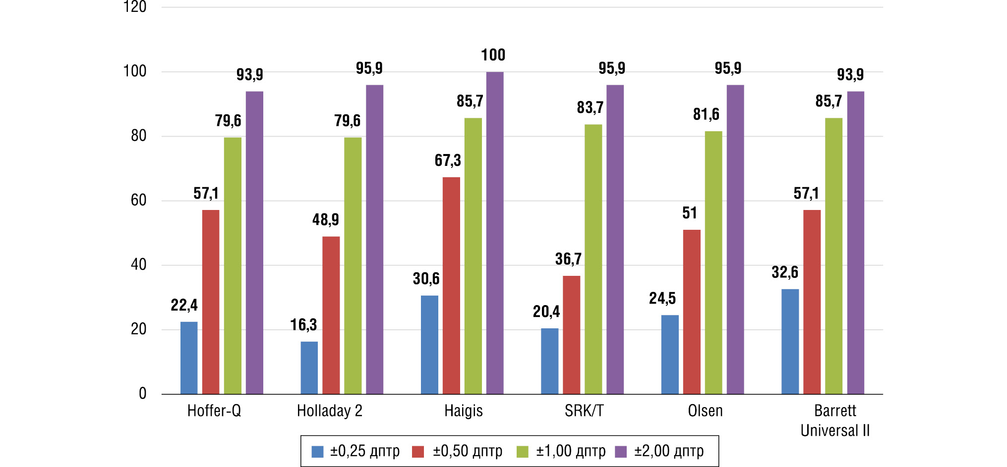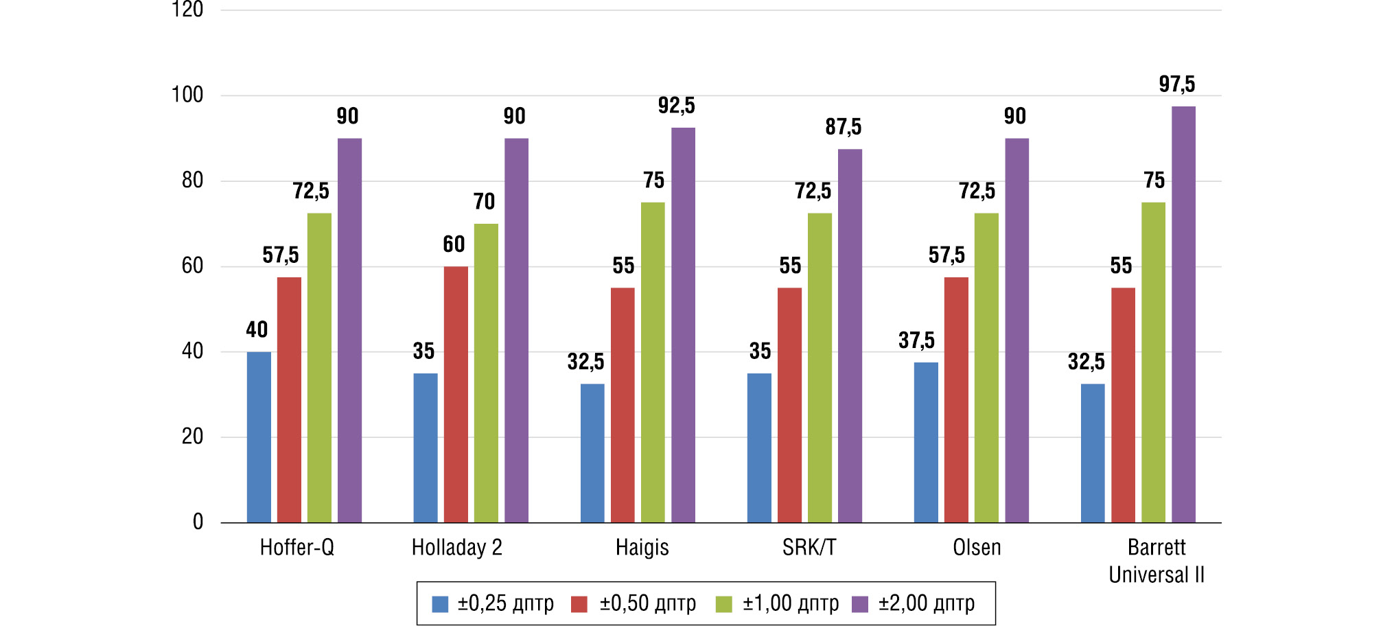 На рис. 1–3 представлен процент глаз с MNE в диапазоне ±0,25, ±0,50, ±1,0 и ±2,0 дптр для каждой формулы по группам. MNE обратно пропорциональна количеству глаз, попавших в целевую рефракцию, т.е. низкое значение MNE соответствует большей частоте попадания в целевую рефракцию.