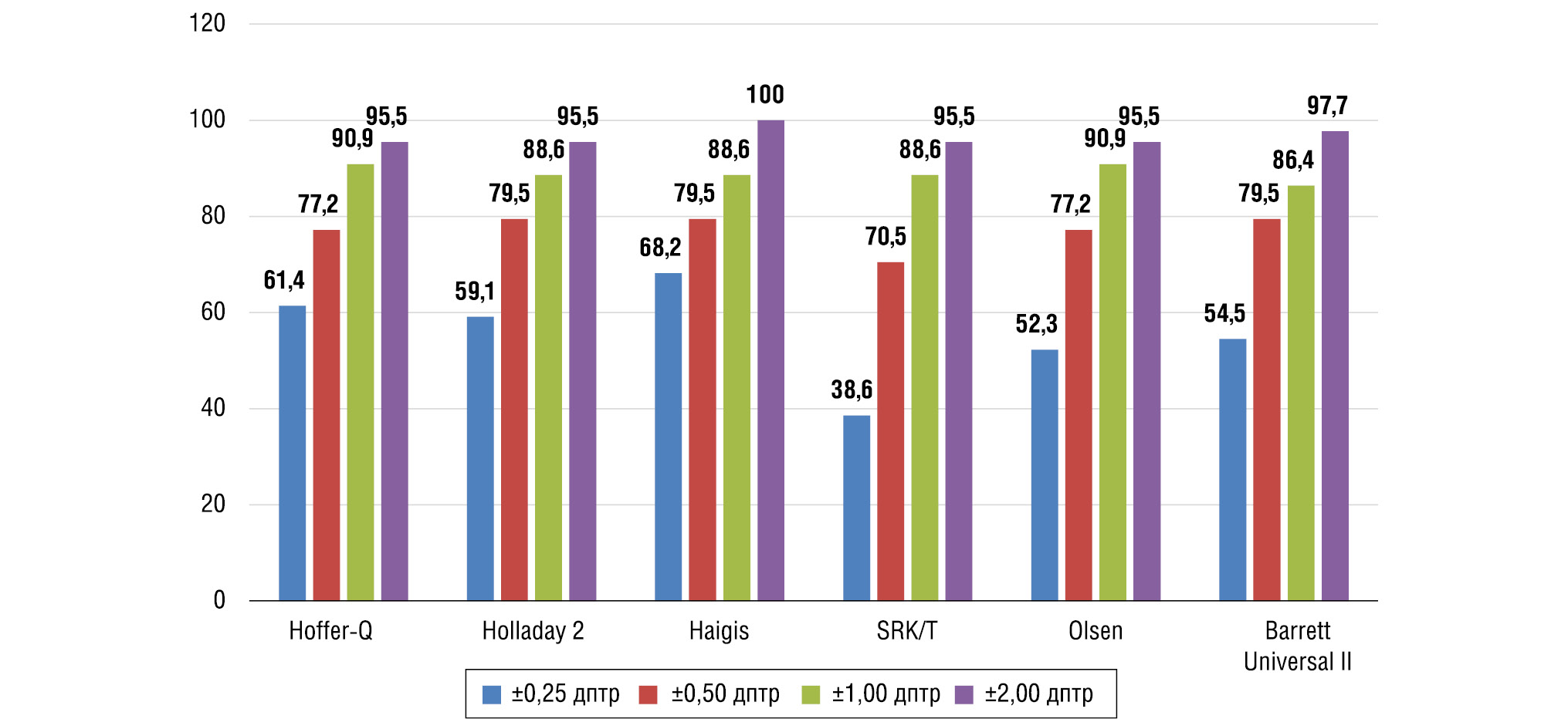 Рис. 2. Процент глаз с MNE в диапазоне ±0,25, ±0,50, ±1,0 и ±2,0 дптр в группе II (n = 30, 49 глаз)
