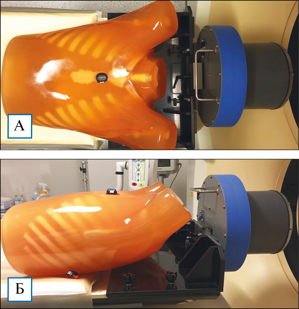 Рис. 1. Укладка фантомов и дозиметров: вид сверху (А) и сбоку (Б)