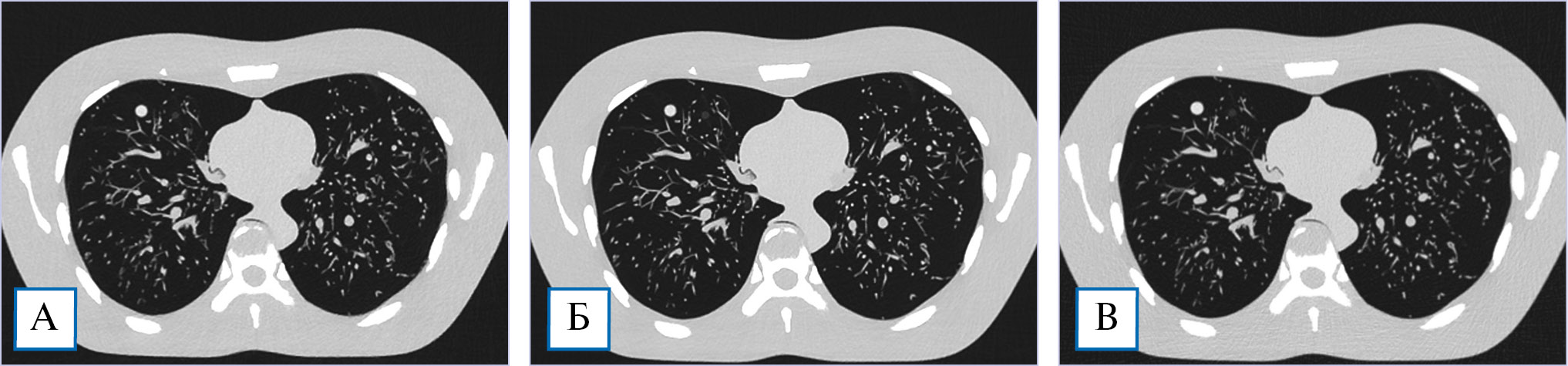 Рис. 2. Компьютерно-томографические изображения антропоморфного фантома в легочном окне: А — модельная итеративная реконструкция при низкой дозе облучения; Б — стандартная компьютерная томография с модельной итеративной реконструкцией; В — стандартная компьютерная томография с гибридной итеративной реконструкцией.