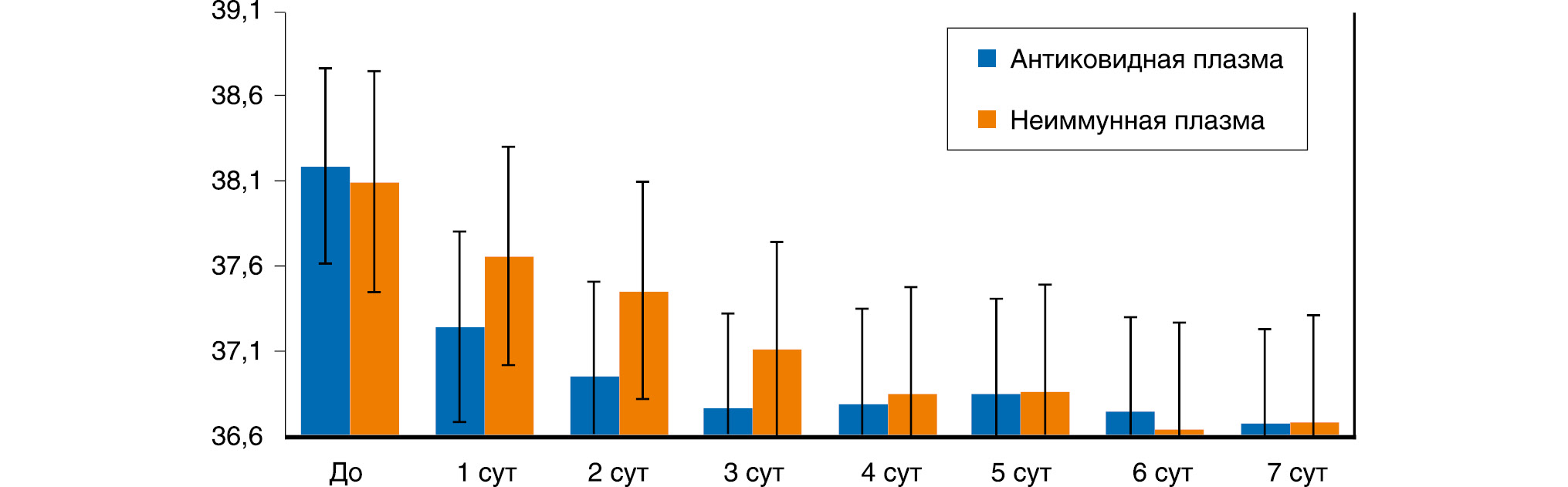 Введение свежеразмороженной одногруппной патогенредуцированной антиковидной плазмы или неиммунной плазмы осуществляли двукратно с интервалом 24 ч по следующей схеме: