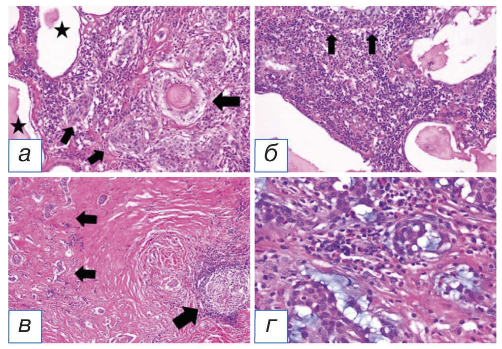 Рис. 1. Иммуногистохимическое исследование: а — опухоль, демонстрирующая комбинацию плоскоклеточных (большая стрелка), промежуточных (маленькие стрелки) клеток и кистозных пространств (звёздочки); б — кистозные пространства, выстланные муцинозными клетками (стрелки); в — на фоне склеротической стромы видны небольшие гнёзда опухолевых клеток (маленькие стрелки), а также лимфоидный фолликул (большая стрелка); г — промежуточная строма между опухолевыми клетками показала богатый эозинофилами воспалительный инфильтрат. Окраска гематоксилином и эозином, ×400.